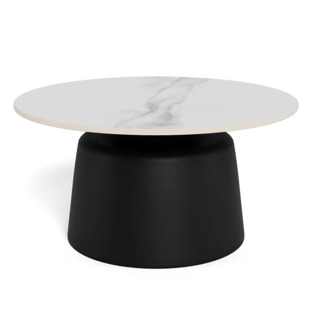 Item Code: H000025004 Santorini round coffee table, top white Unico rough ceramic, pillar base matt black rough powder coated steel. This round coffee table steps out of convention with its striking expression. With a round ceramic top and black robust pillar base made of steel, it brings a vibrant energy to the living area. The white top reminds of a marble with its veins yet is heat and scratch resistant.Free Delivery