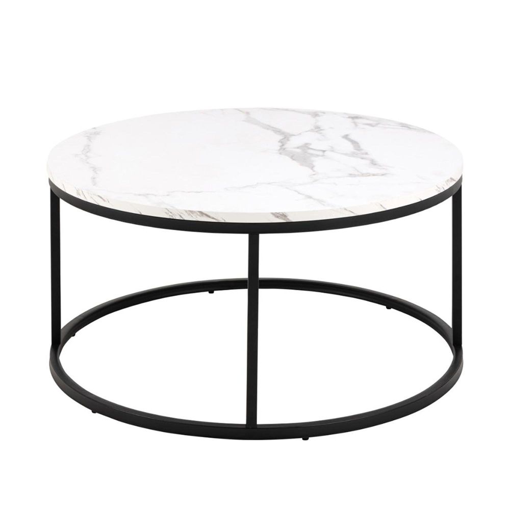 Item Code: 98860 Spiro round coffee table, top white marble Granada rough melamine, base matt black rough powder coated steel. Thanks to the round top and matching round base, this coffee table will create a calming flow in your living room. The white marble look gives the table a modern feel and when combined with the black rough powder-coated metal base, it will fit into most homes. Now, enjoy that tea in style.Free Delivery