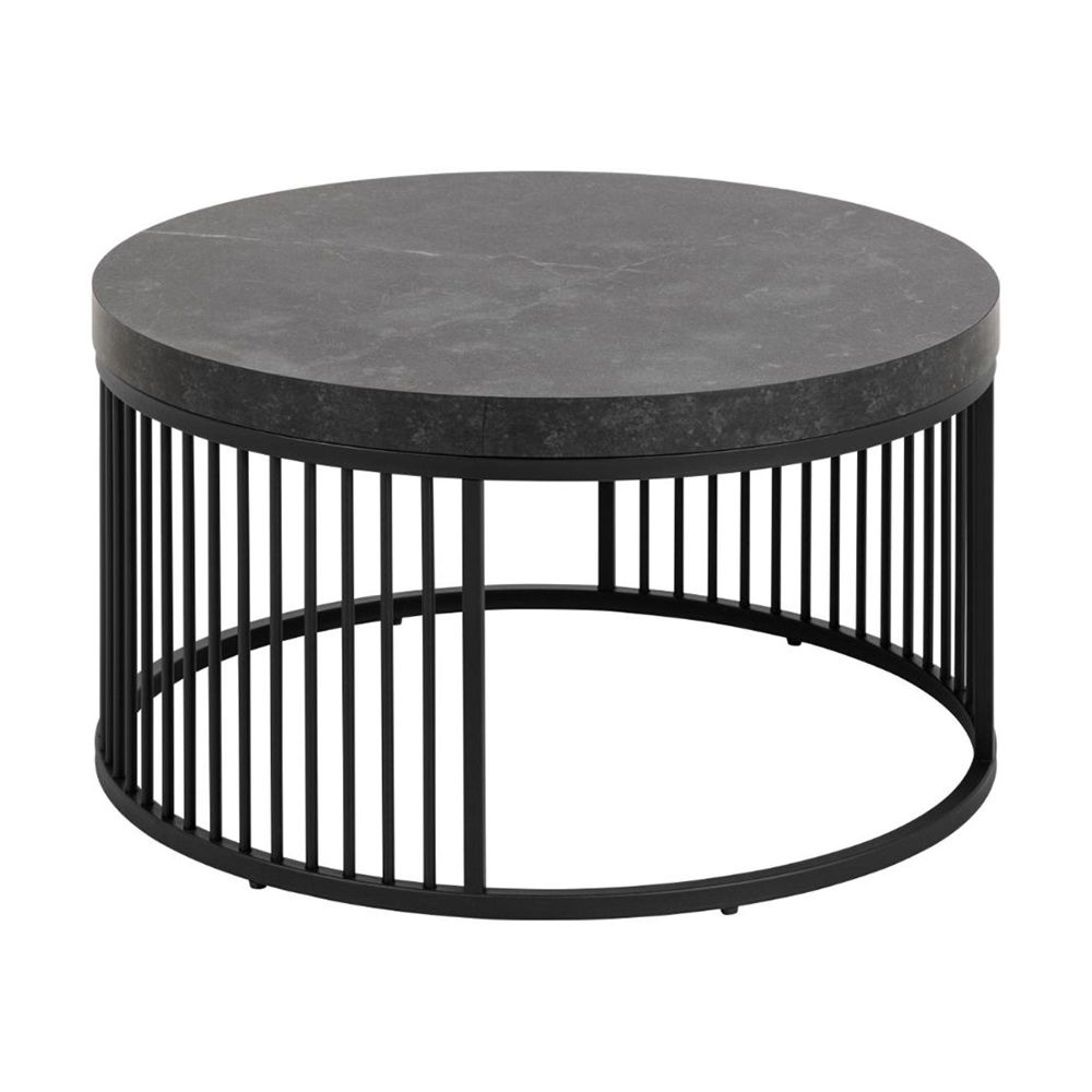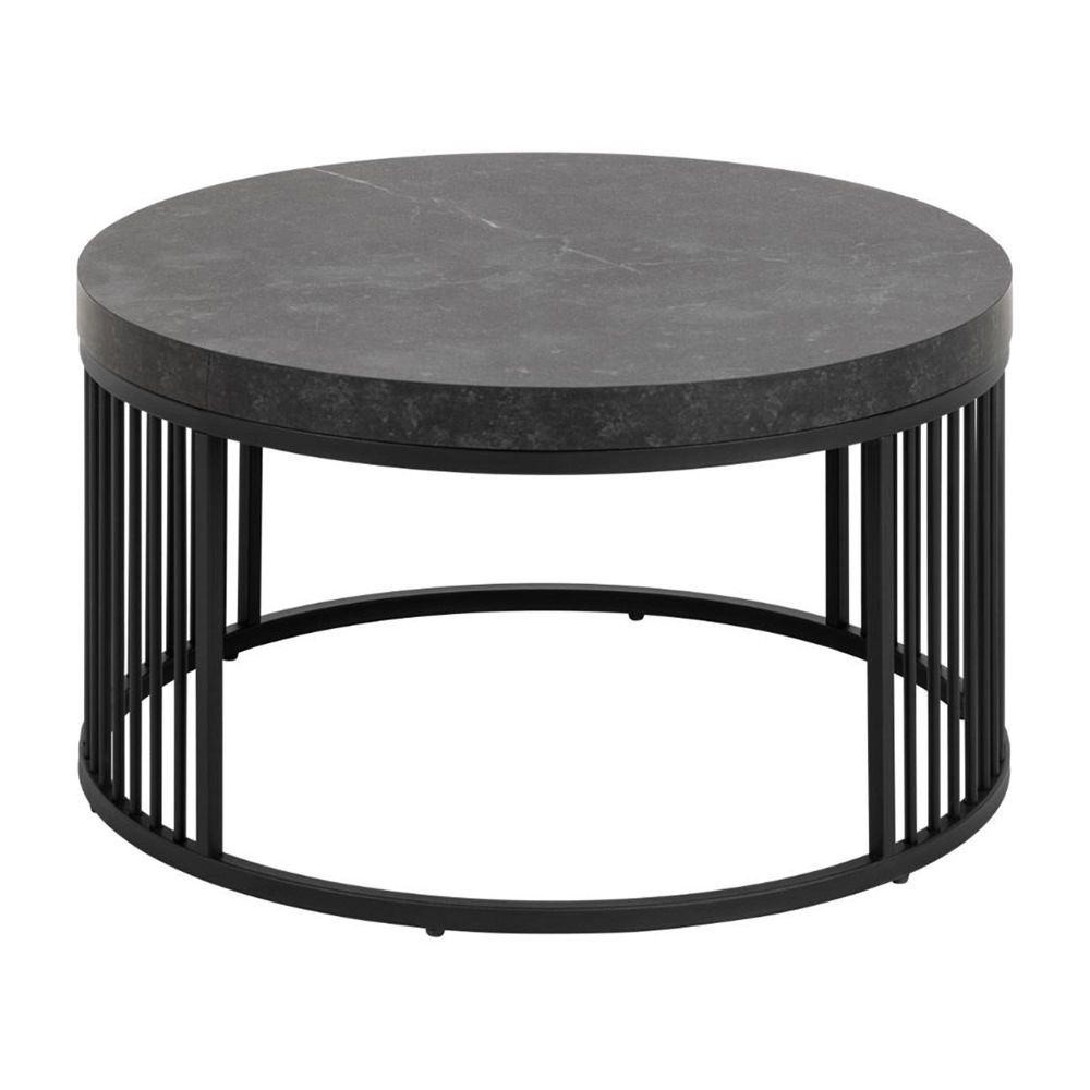 Item Code: 108051 Strington round coffee table, top matt black Izmir rough melamine, wire base matt black rough powder coated steel. This round coffee table stimulates the sight with striking elements that give it its signature look. The bold round top, decorated with a black marble look, is set into a black steel frame with vertical wires. The combination creates a flattering contrast between the two elements. Such a design makes a lasting impression in any living space.Free Delivery