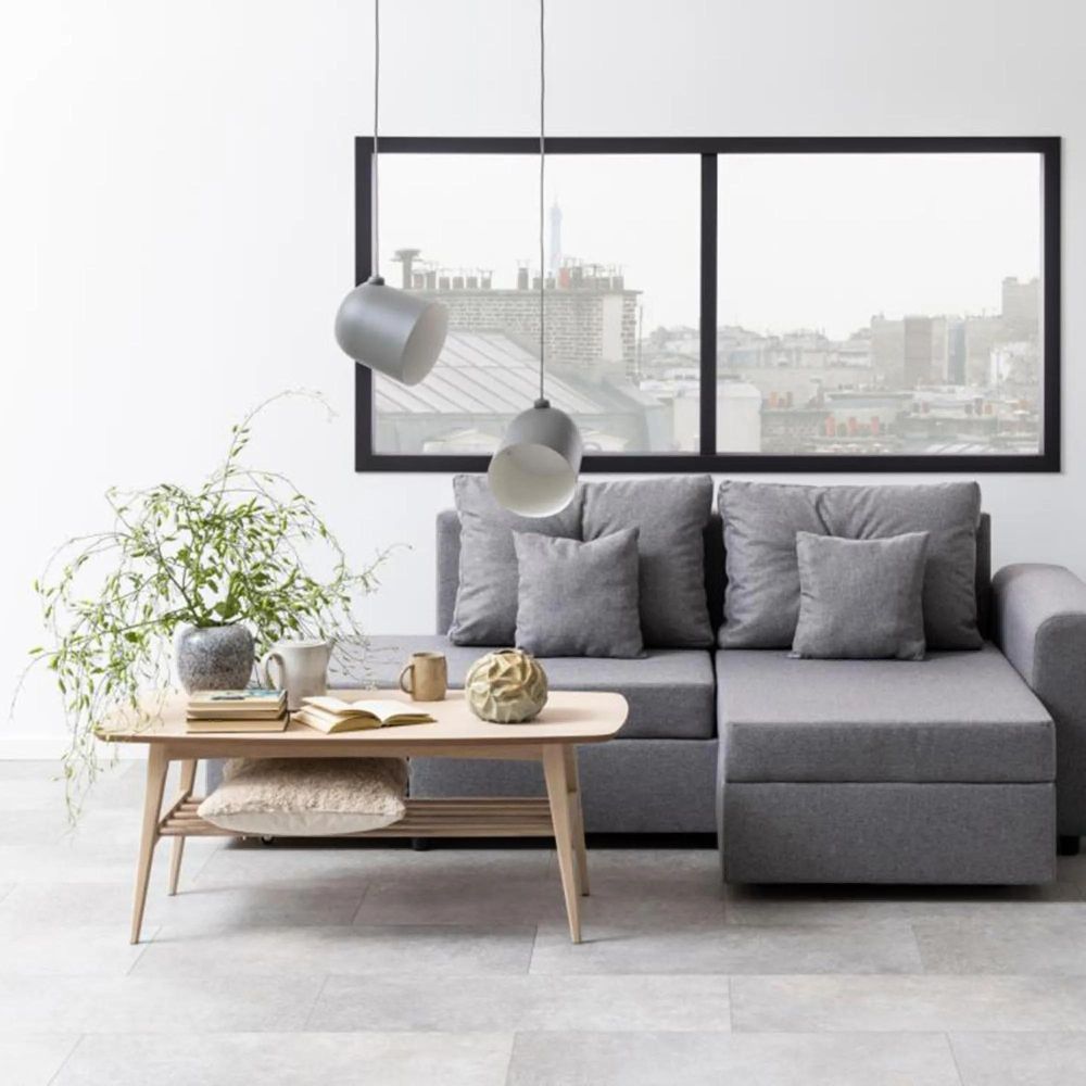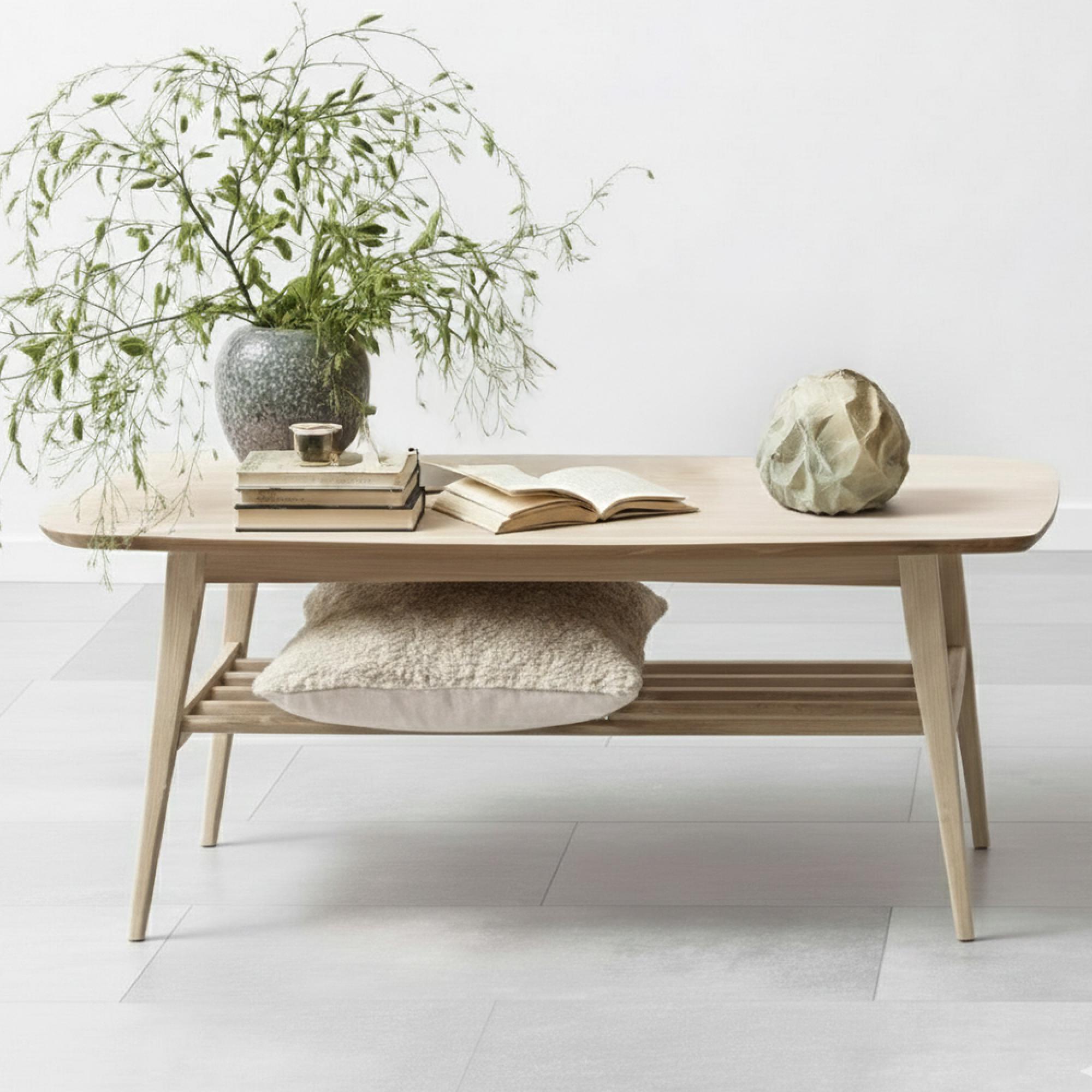 Item Code: 107927 Woodstock rectangular coffee table, top white pigmented oiled oak veneer, shelf and base white pigmented oiled oak. This coffee table, designed in a classic Scandinavian style, is treated with white pigmented oil for a clean look. Boasting a rectangular shape, the table appears inviting with its oak veneer top with rounded corners. A convenient lower shelf provides space for your favourite reads, while the tapered oak legs complement the overall aesthetic.Free Delivery