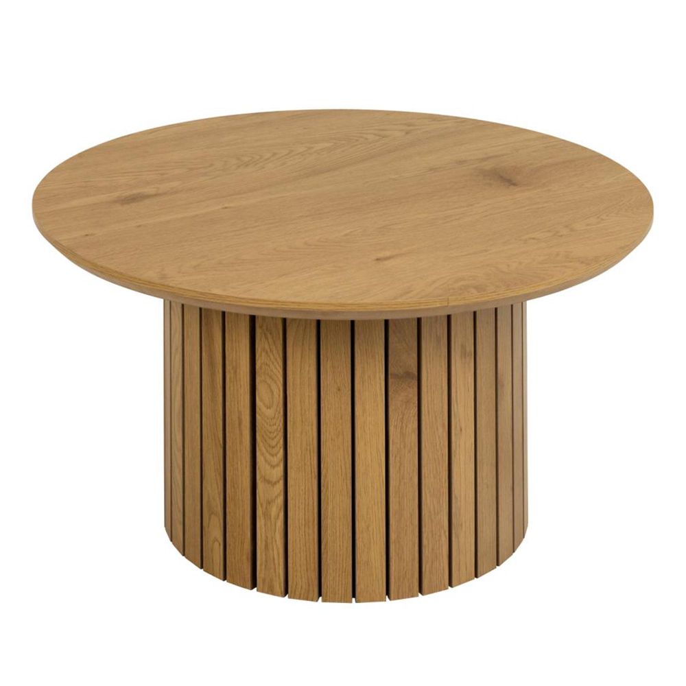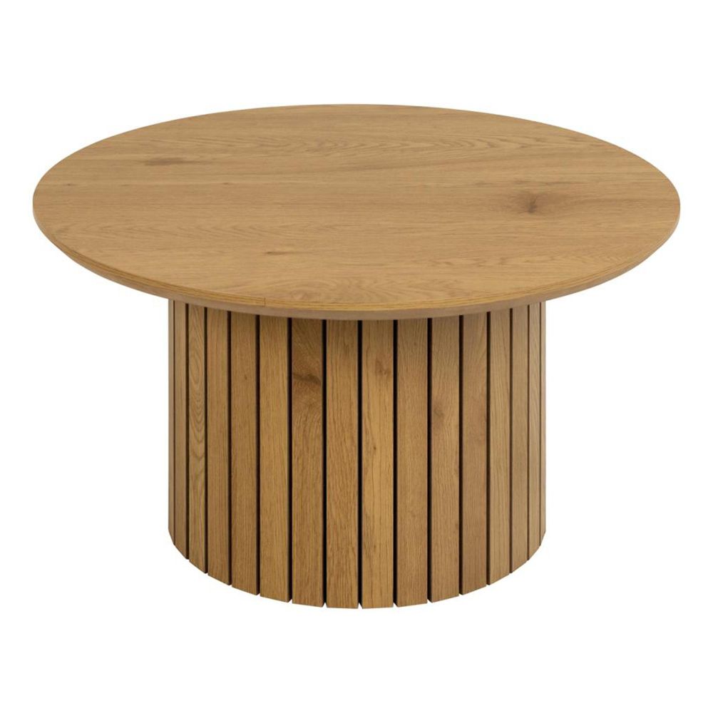 Item Code: H000022542 Yale round coffee table, top and pillar base matt wild oak rough melamine with lamella front. Embrace Scandinavian design and enjoy the natural feel of this coffee table. On the round tabletop with wild oak look, there is plenty of space for snacks and drinks. It is supported by a round lamella base which gives the design an elegant look. The base comes in one piece but needs to be assembled, which is easy to do thanks to a simple solution.Free Delivery