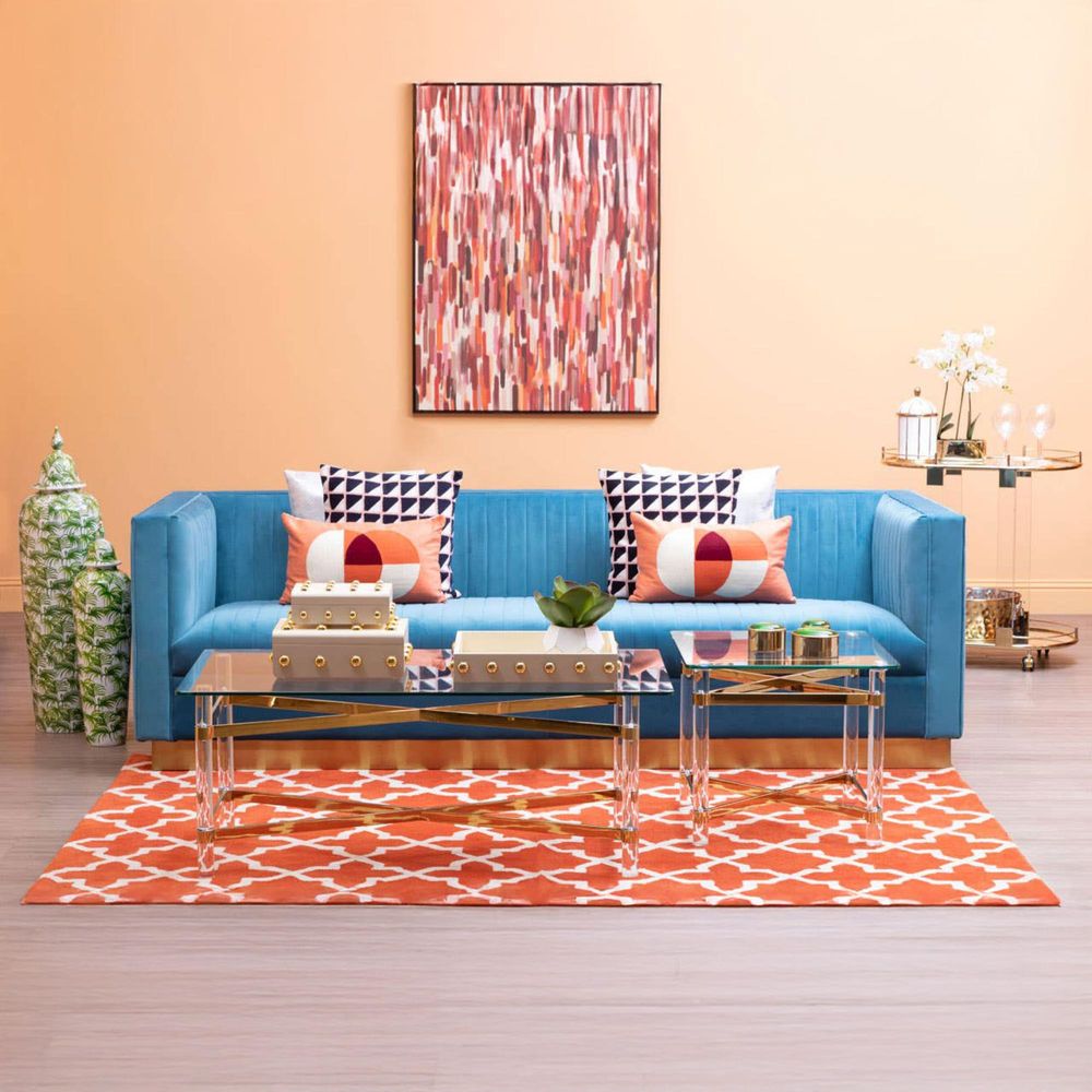 Item Code: 5501661 The Clarence coffee table features clear acrylic legs and tempered glass design tabletop.Four cylindrical, clear acrylic legs support the Clarence coffee table's substantial top. The transparent appearance of the tempered glass top complements the legs and creates a contemporary look. Two metal cross designs connect the four legs with a reflective gold finish lending them luxurious appeal.