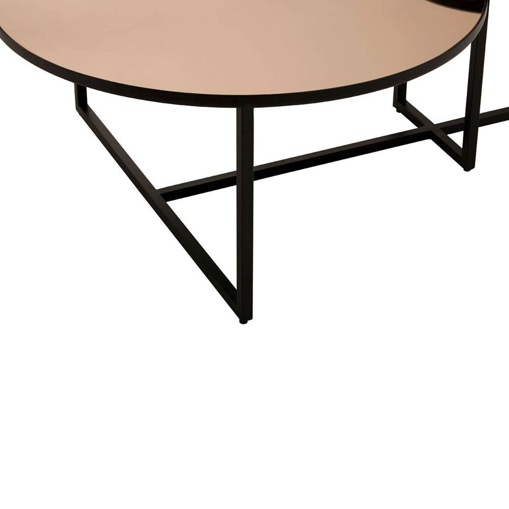 Item Code: 5528767 A mix of clean and rounded lines combine to create the quirky design of this coffee table.Featuring an elegant juxtaposition of style and form, this coffee table has circular smoked mirror tops positioned at different levels. The black finish frame extends to support the large and small tabletops through clean, asymmetric lines.
