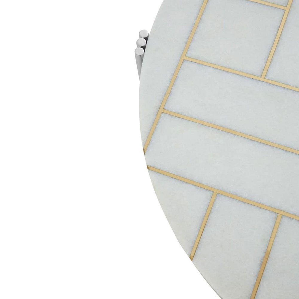 Item Code: 5502391 A round section of white marble creates the top of the luxe-style Eva coffee table.A distinctive geometric design embellishes the table's top, it's striking gold finish contrasting with the crisp white marble top. The table's art deco style frame counterpoints the warm metallic design with its cool silver finish.
