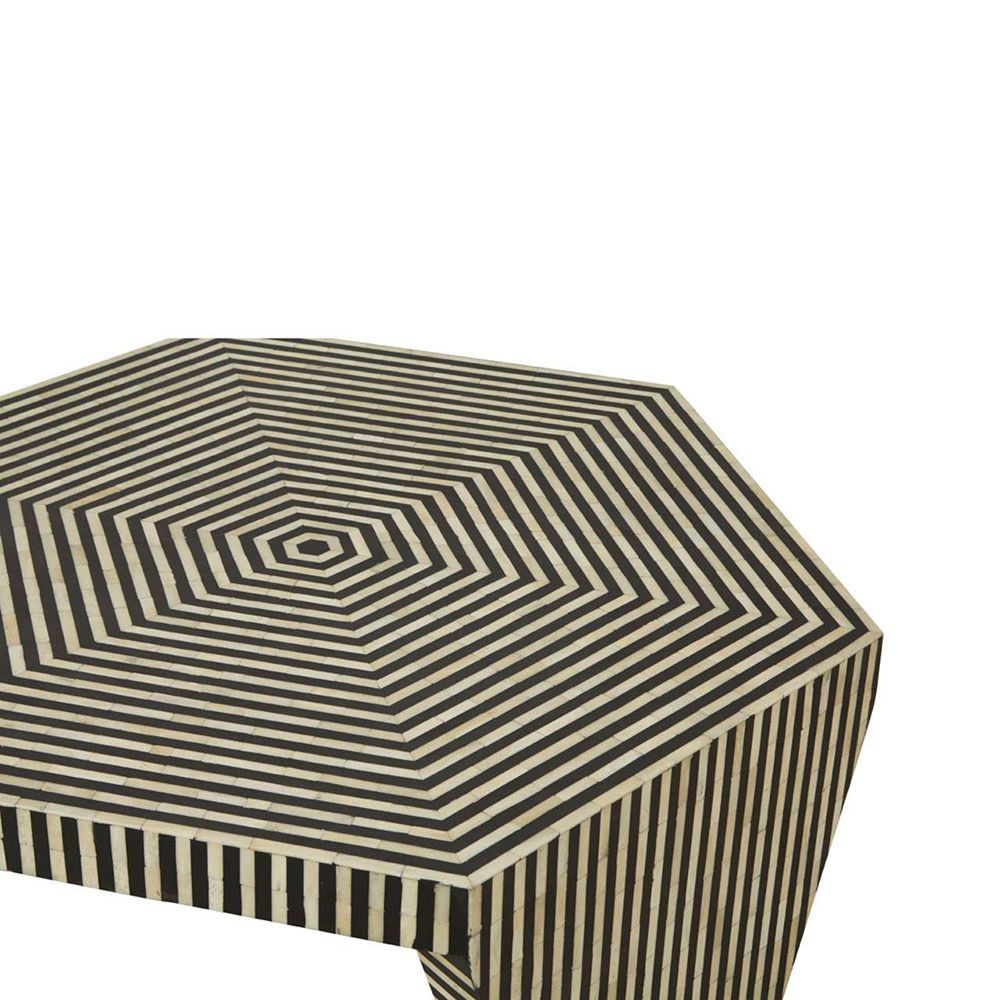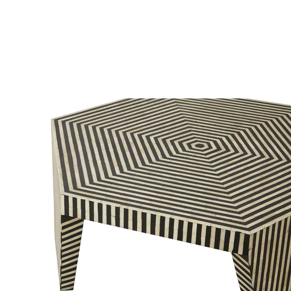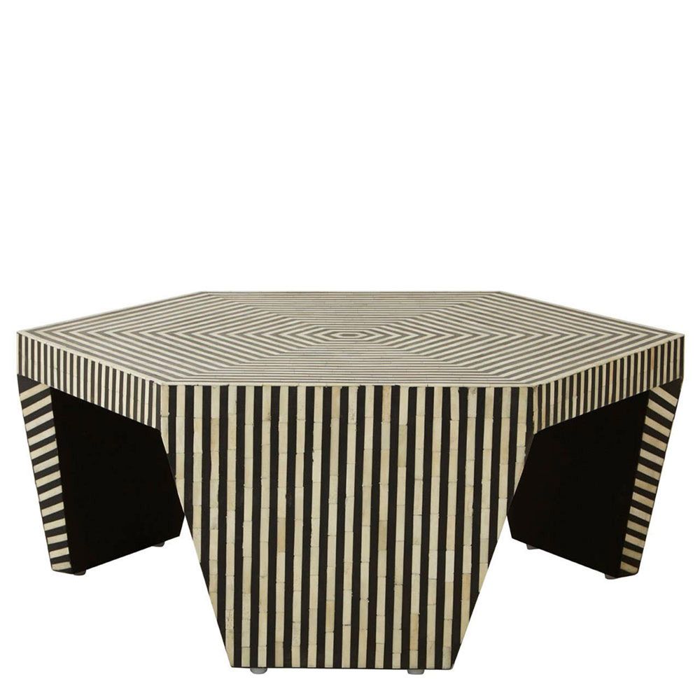 Item Code: 5527147 The Fusion hexagon coffee table with cutout bone inlay detailing and monochrome accent will update a distinctive statement to transitional decors. Handcrafted in India by skilled artisansHandcrafted in India by skilled artisans this coffee table has a hexagonal top adorned with carved bone inlay detailing in a black and white vertical stripe design, forming a hypnotic pattern. The geometric top is supported with tapered legs this table will add a statement piece to any living space in your home.