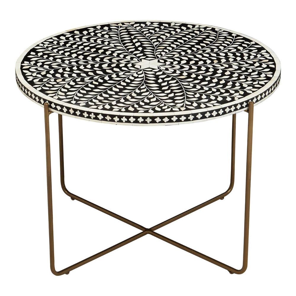 Item Code: 5529033 This coffee table with white bone fragments adhered to black wood and a minimalist base will make a provocative statement with eclectic or boho decors.This coffee table features an intricate floral pattern made from individually laid white bone on black wood, creating a timeless appeal. The patterned top in unique detail is supported with sleek old finish legs featuring a modern cross design that counterpoints the traditional aesthetic.