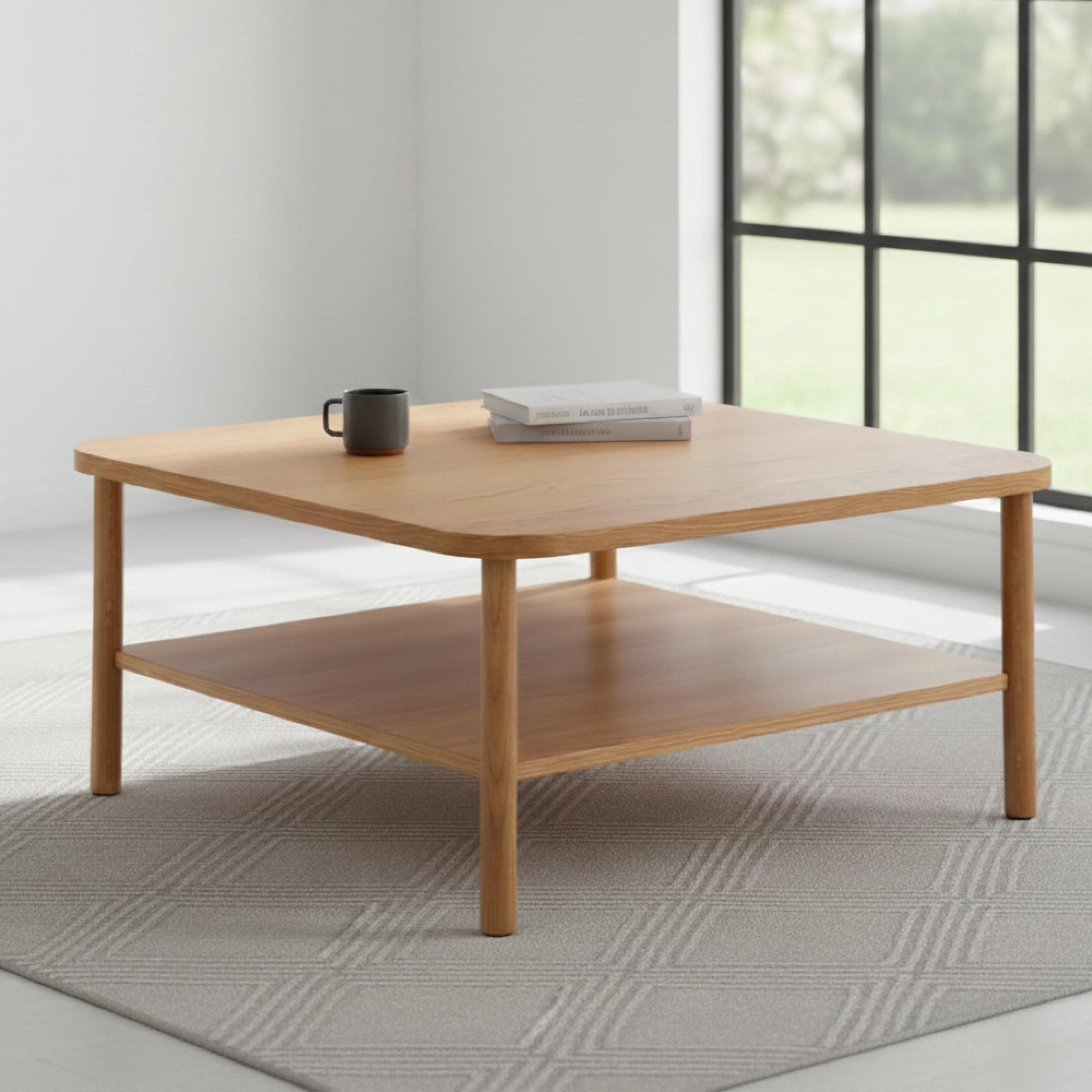 Item Code: 111795 Banbury square coffee table, top and shelf oak PU lacquered veneer, base NC lacquered oak. Crafted with a lacquered finish, this two-tiered coffee table is designed to bring warmth and cosiness to the living room. The square top with smooth edges, provides an ideal display surface for small decor. With a shelf below, all magazines stay within reach. Such a design will easily add style to the living room. FSC certified.Free Delivery