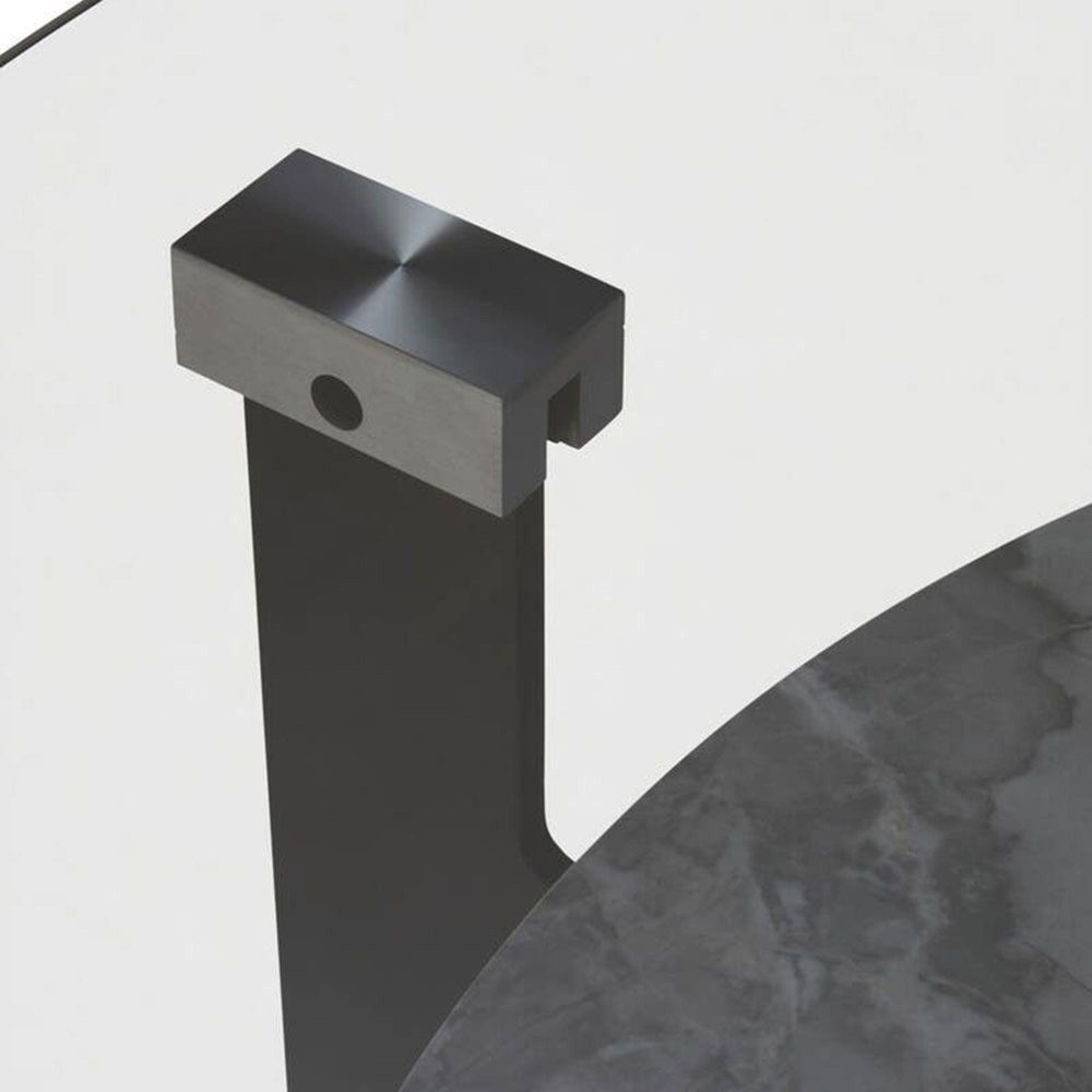Item Code: 5528863 This round coffee table combines a grey glass top with a white ceramic lower shelf, supported by elegant black coated iron legs for a modern look.The Imperia large round coffee table features a sleek grey glass top and a lower shelf with a ceramic marble effect, offering a modern and elegant contrast. The entire structure is gracefully supported by four distinctive black metal legs that provide stability and a bold, architectural flair.