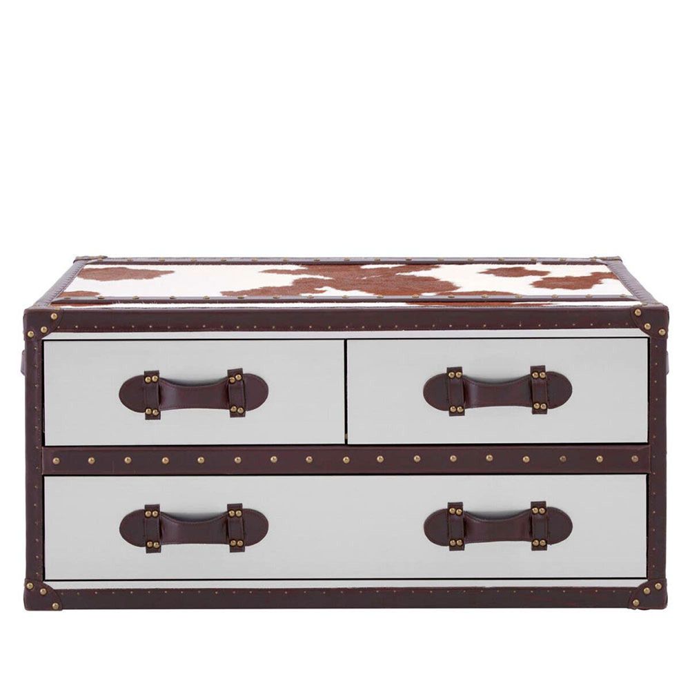 Item Code: 5501169 This stylish coffee table adds an animal print accent to the living room andv hallway.Its three drawers boast sleek aluminium facing, with genuine leather strap handles contributing to the monochrome look. Reflective metal studs glint against the genuine leather trim that borders the table. Decorative handles at the side accentuate the travelling trunk look. This product is made from genuine cowhide. Individual units are likely to have slightly different colours, textures, or markings from the image as this is a natural material.
