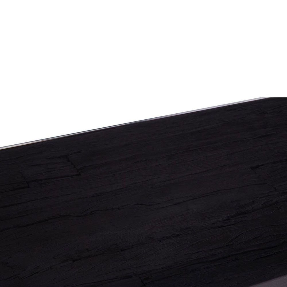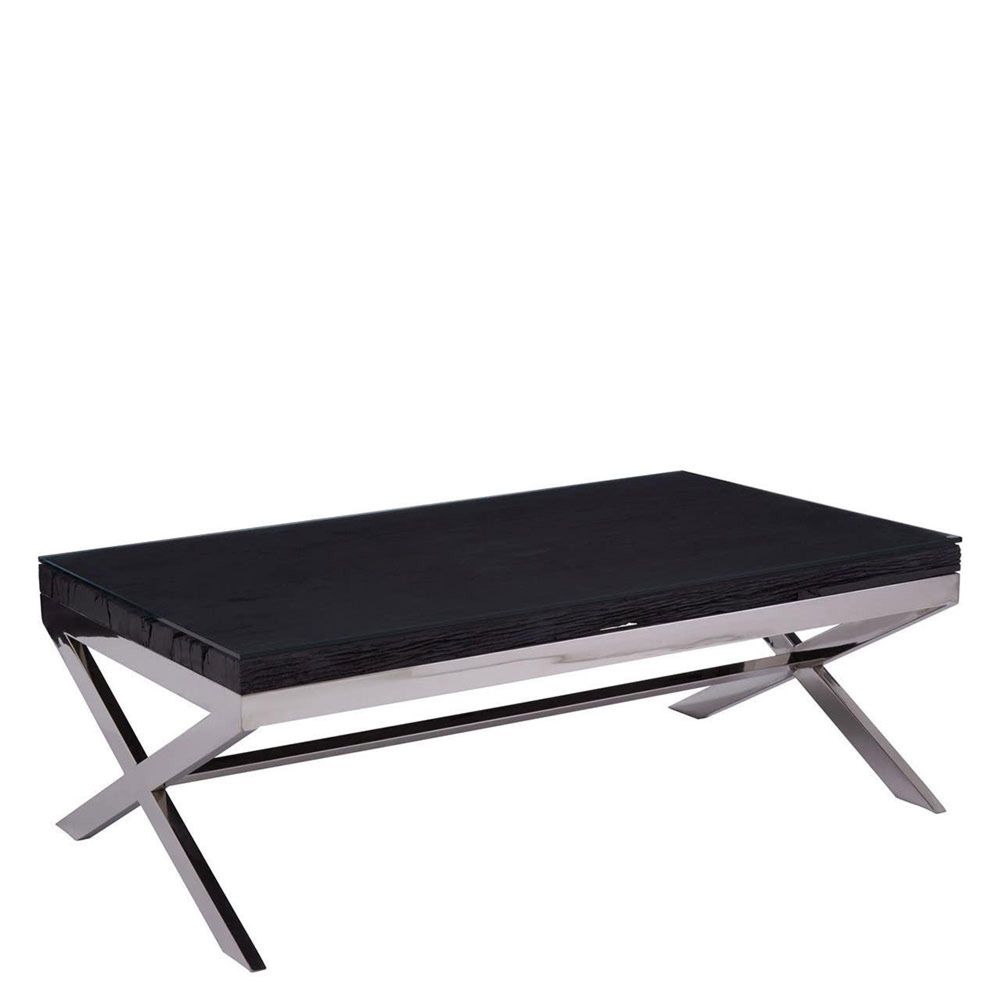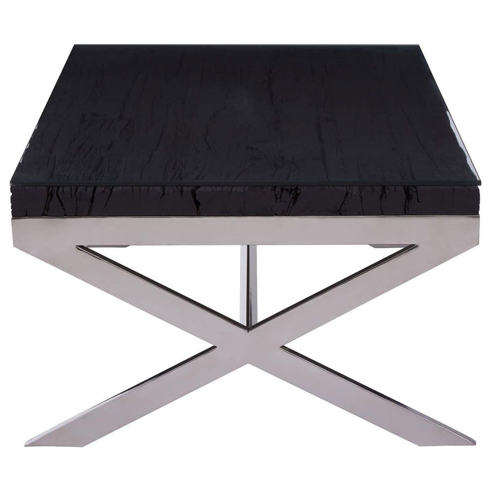 Item Code: 5527853 The Kerala black coffee table will bring a touch of natural warmth and character to the contemporary living area.Black finish salvaged wood is neatly handcrafted to create the rectangular top of this coffee table. A glass slab rests on the rustic top offering a clear aesthetic to wood grain and texture while X-design base in the silver finish contrasts the understated top.