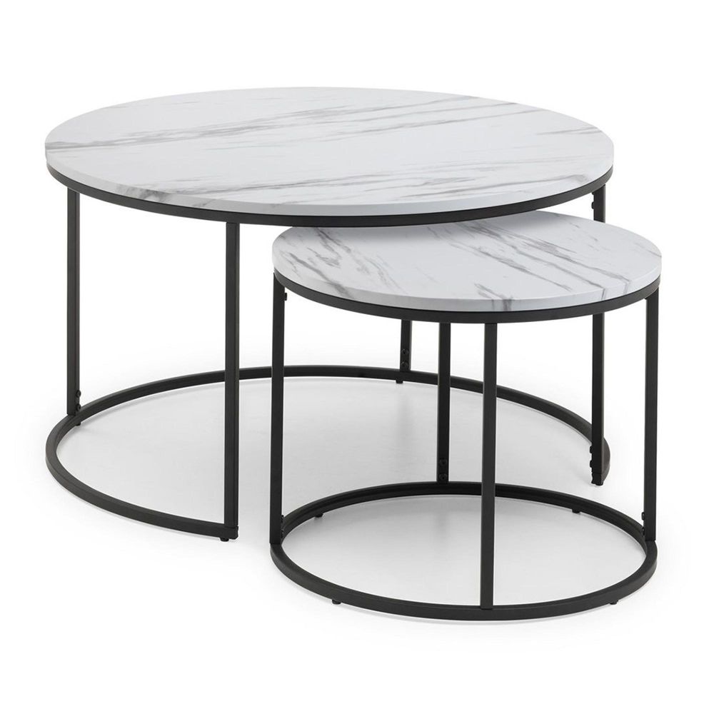 Item Code: BEL103 The Bellini Round Nesting Coffee Table ensures long lasting durability, crafted from black coated metal and MDF in an white marble foil finish. This set of two coffee tables boast a contemporary, stylish design with an industrial feel. Ensuring a space saving solution, the coffee tables slot together as and when they are in use.