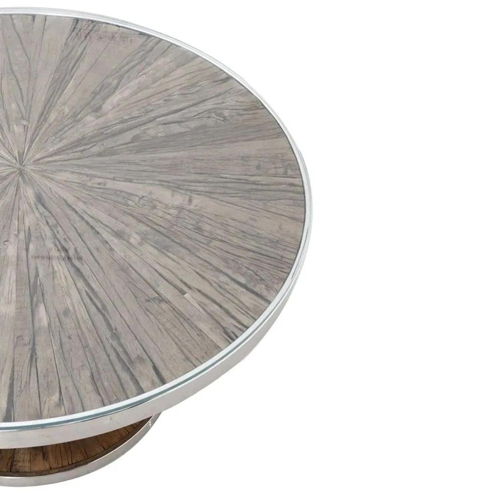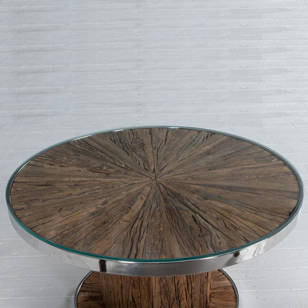 Item Code: 2158 This beautiful statement piece will bring a chic modern flair to any living space. Crafted from reclaimed wood and stainless steel chrome trim, it has a round column base and glass top. This stunning coffee table looks great without storage, and is easy to assemble with flat packed parts. Add timeless elegance to any interior with this stylish item.