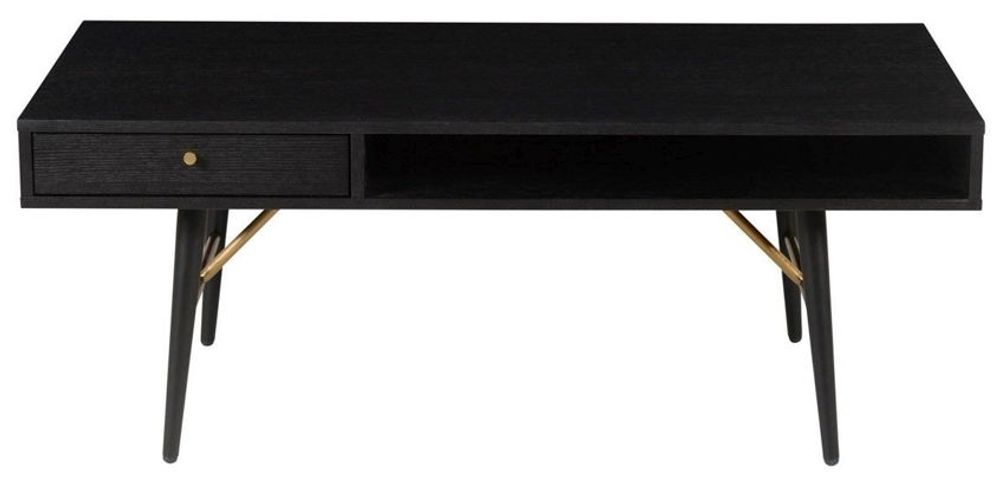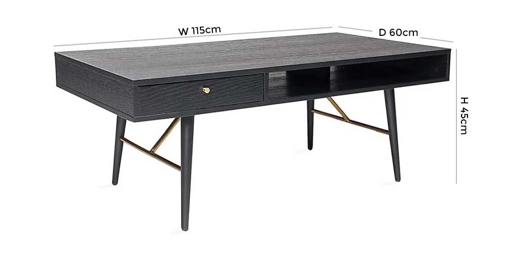 Item Code: Bar-007-BK Black oak melamine, powder-coated black metal legs, copper metal accents. Features: