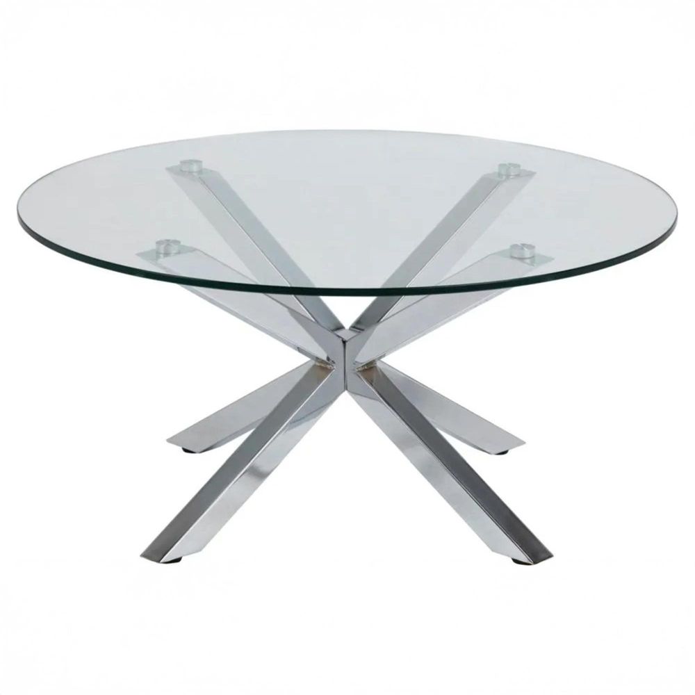 Item Code: 59573 This modern coffee table adds an elegant touch to any decor. Features a clear tempered glass top with chrome finish and a metal base for durable, sustainable use. Make a bold statement of style in your home with its round design adding a touch of sophistication and contemporary taste to your place. Enjoy a luxurious look in your living room with this part assembled, accent piece.