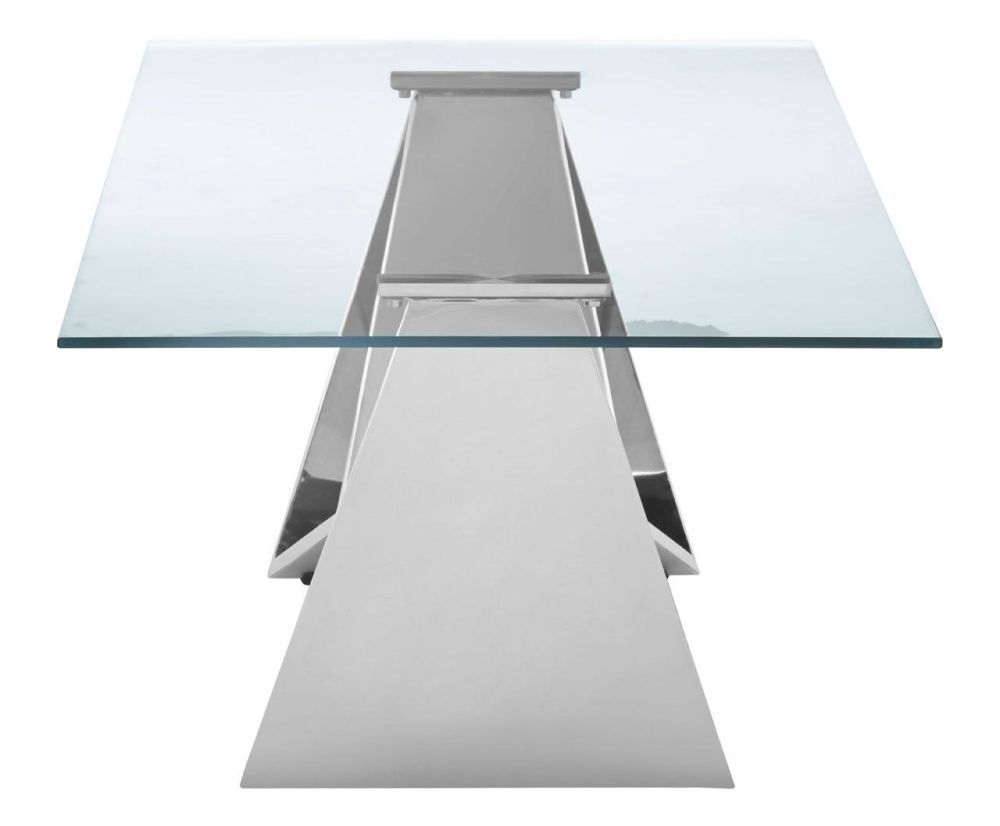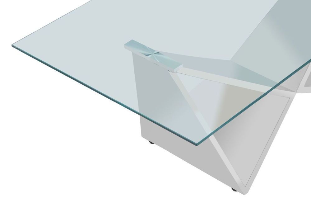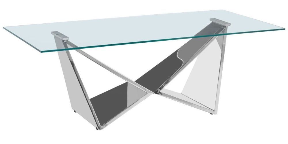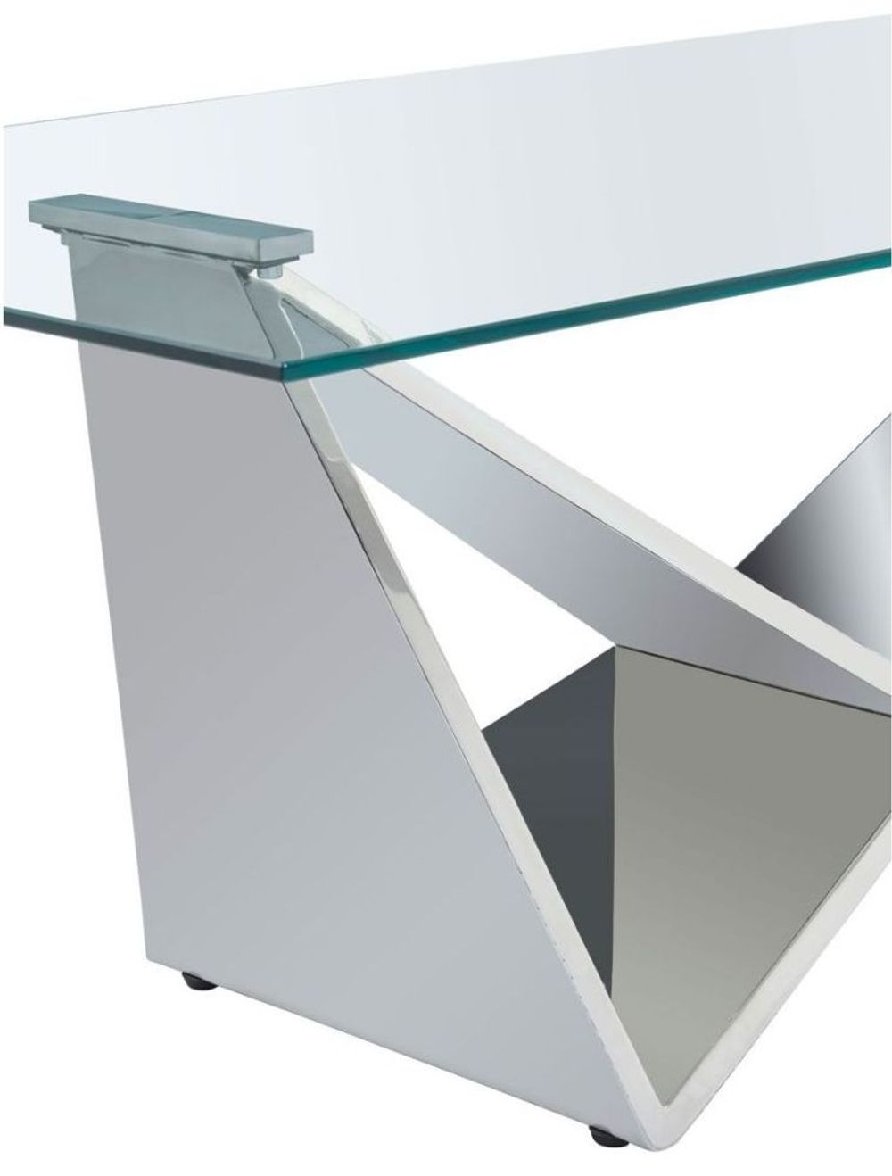 Item Code: 5502579 The Allure coffee table is a sophisticated, symmetrical luxe accent piece.A pair of triangles made from sleek stainless steel are arranged at an angle beneath the clear tempered glass top. The steel has a reflective finish that complements the glass. Part of the Allure collection, it's a great way to introduce a highly reflective accent piece to the living room.