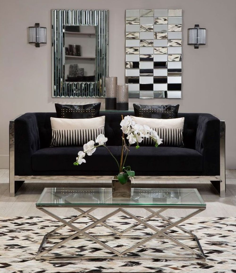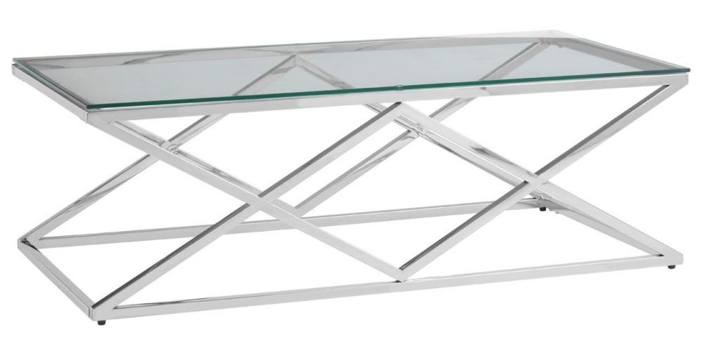 Item Code: 5502548 This coffee table uses sleek, inverted lines to make a contemporary design statement.The Allure coffee table has a distinctive geometric design, with its inverted triangle forms producing bold diamond shapes. The smooth stainless steel frame has a reflective silver finish, and the rectangular top is made from clear tempered glass. Display it in the living room to make a luxe design statement.