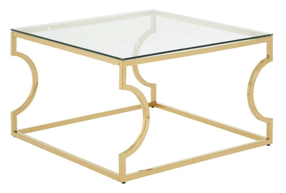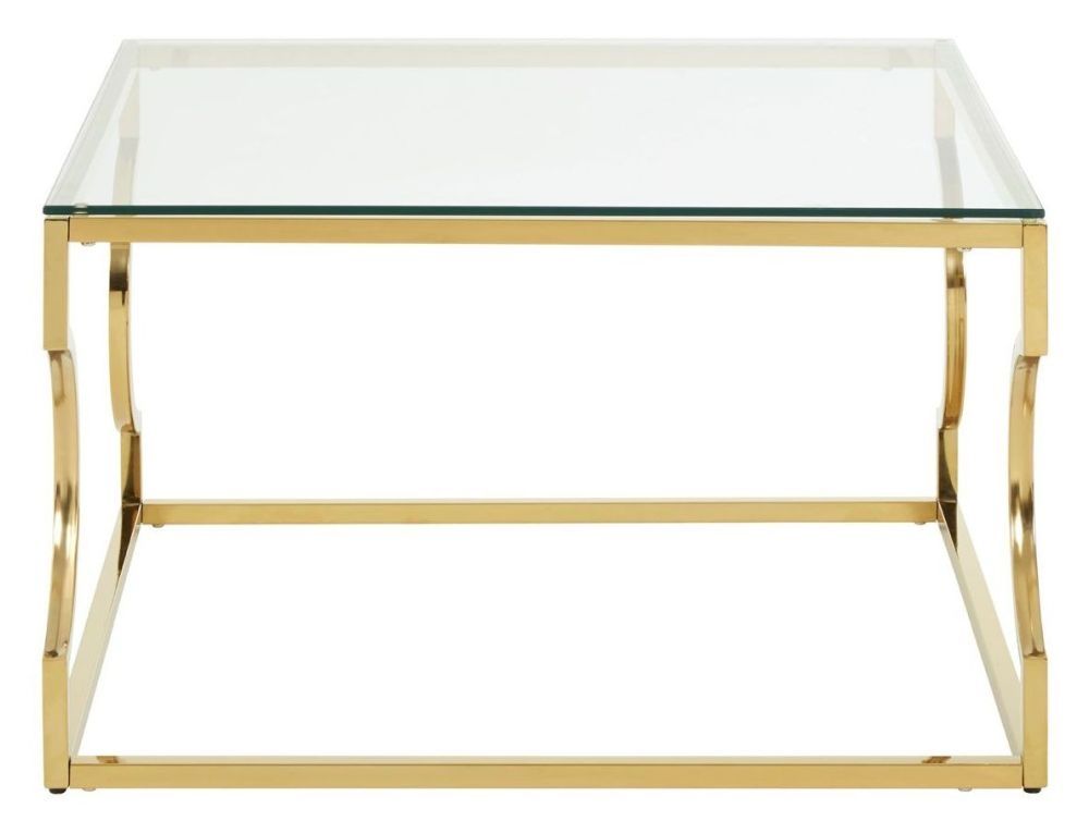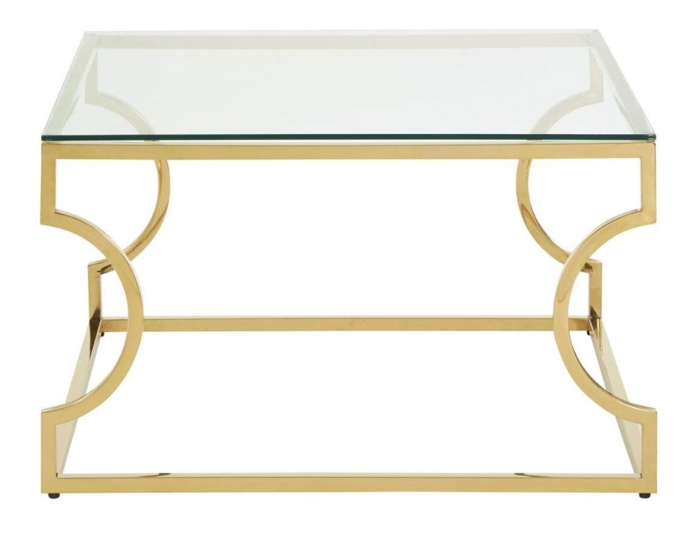 Item Code: 5502559 A modern luxe coffee table with design lines inspired by glamorous art deco style.emi-circular indents at each side subvert the angular lines of the Allure coffee table. Made from smooth stainless steel, the frame boasts a gold finish that makes the table coordinate well with warm metallic accessories. The table is topped by a square pane of clear tempered glass.