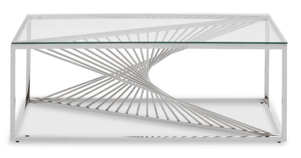 Item Code: 5528350 Add a touch of contemporary styling to modern home decor with this coffee table featuring a spiral staircase inspired centre.This coffee table brings an elegant juxtaposition of charm and opulence with its clean lines and a decorative abstract centre in the metallic silver finish. The clear glass sits above the sculptural base and enhances sophistication.