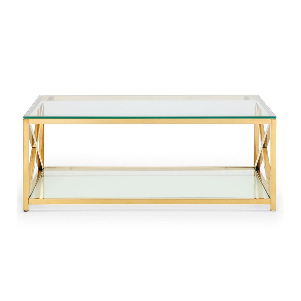 Item Code: MIA201 The lavish Miami occasional collection will add a touch of class and luxury to any home. Taking inspiration from the Art Deco period, the Miami features a striking cross frame design. Crafted from a gold finished frame and tempered glass, this coffee table provides a shelf underneath for additional storage.