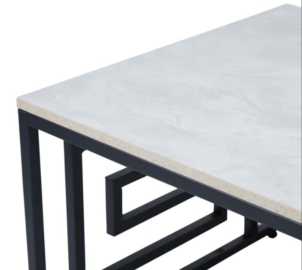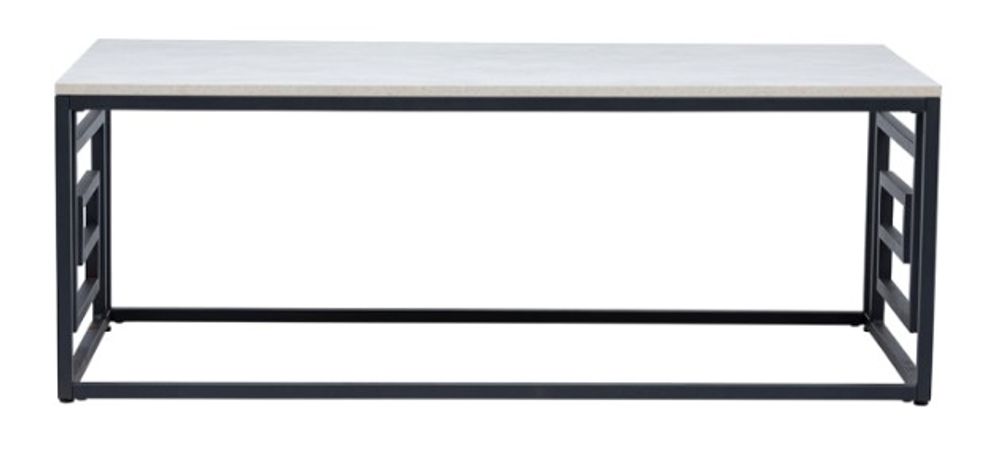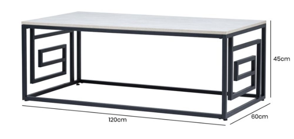 Item Code: MF324-00-BLGY Add a crisp, modern feel to any living area with the Devon coffee table. It features a black metal frame with Grecian inspired design on the side panels, with grey wooden, faux concrete finish top.