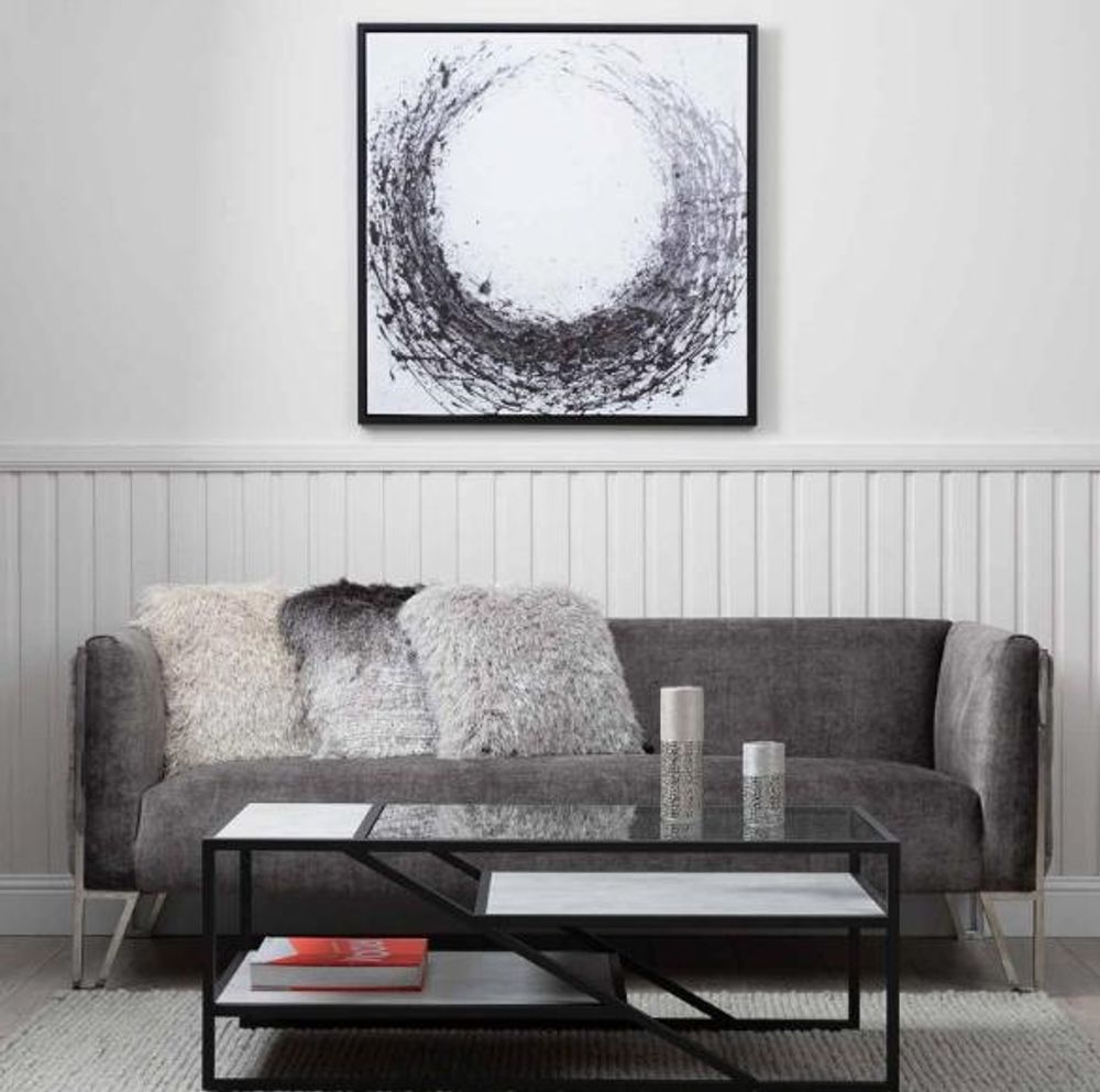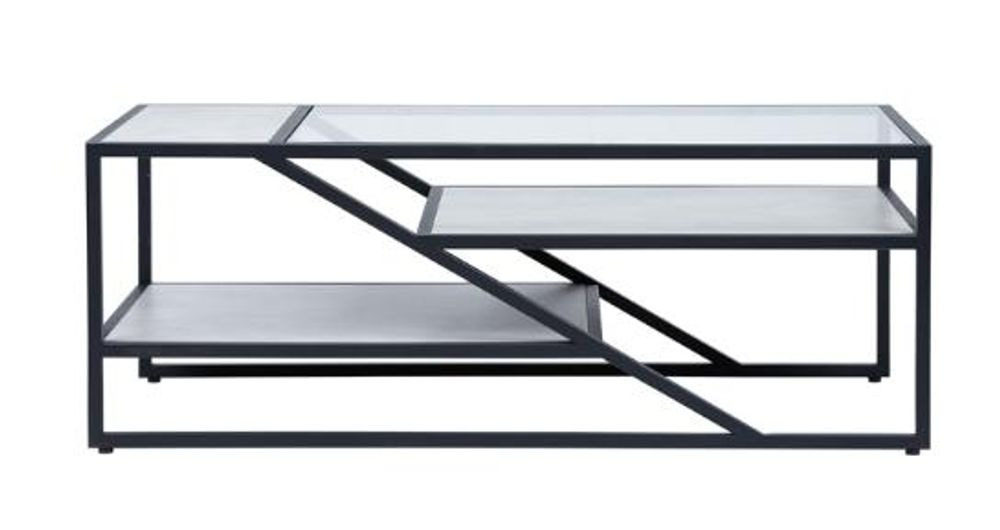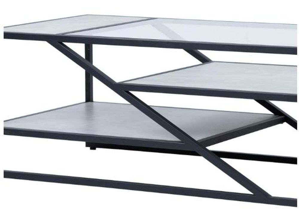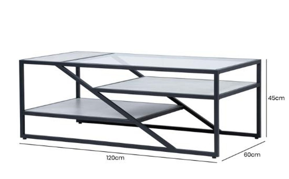 Item Code: MF321-00-BLGY If you are seeking a quirky, minimalistic look then this Aileen coffee table is definitely for you! Consisting of a black metal frame and three-tiered grey wooden, faux concrete finish, and glass shelves, this piece will enhance any modern living area.