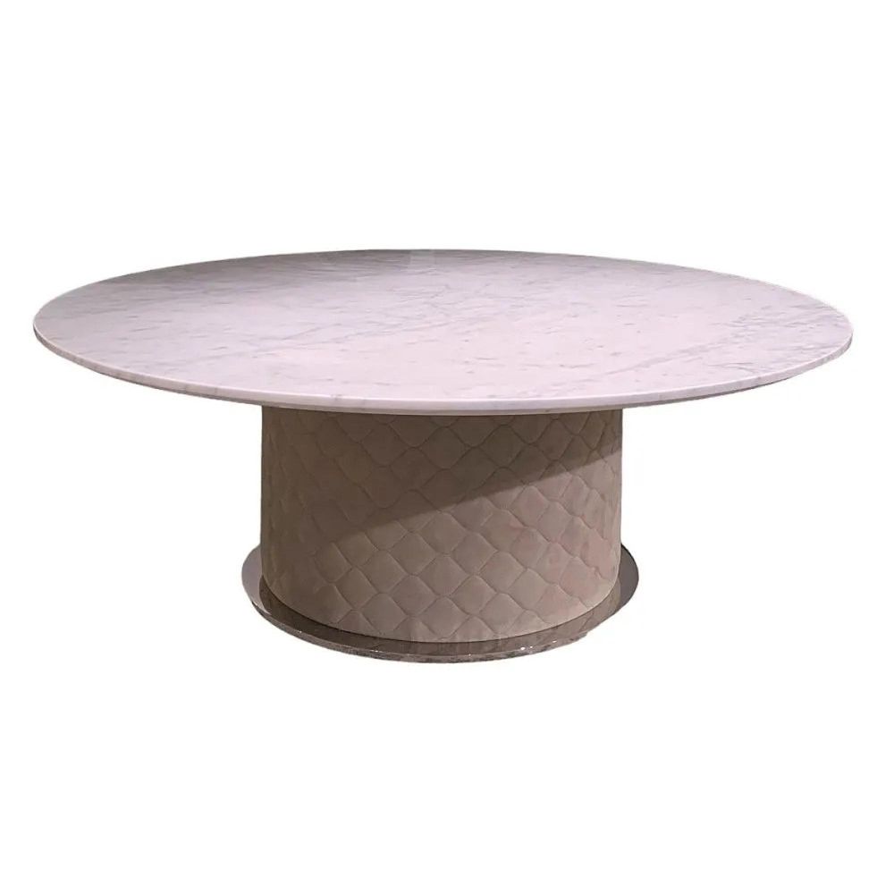 Item Code: Note : Custom made sizes available please contact us on 0116-296-3800.The PRESTIGE Tables Collection features a sophisticated Contemporary Classic design. The subtle marble top rests on a single or two bold-in-proportion cylindrical pedestals that can be varnished or hand-covered withunique textiles available in multiple colors and patterns. The base metal round platforms are the details that make perfection. Tables available in rectangular or round shape. Cylindrical legs varnished in any available metallic finishes or hand-covered in any ECO Nabuk finishes. Base platform in polished steel or any available metallic finishes. Boat shape or Round marble top in any available natural stone finish with thin knife edge bevelling.