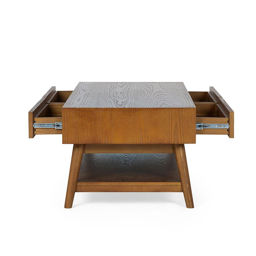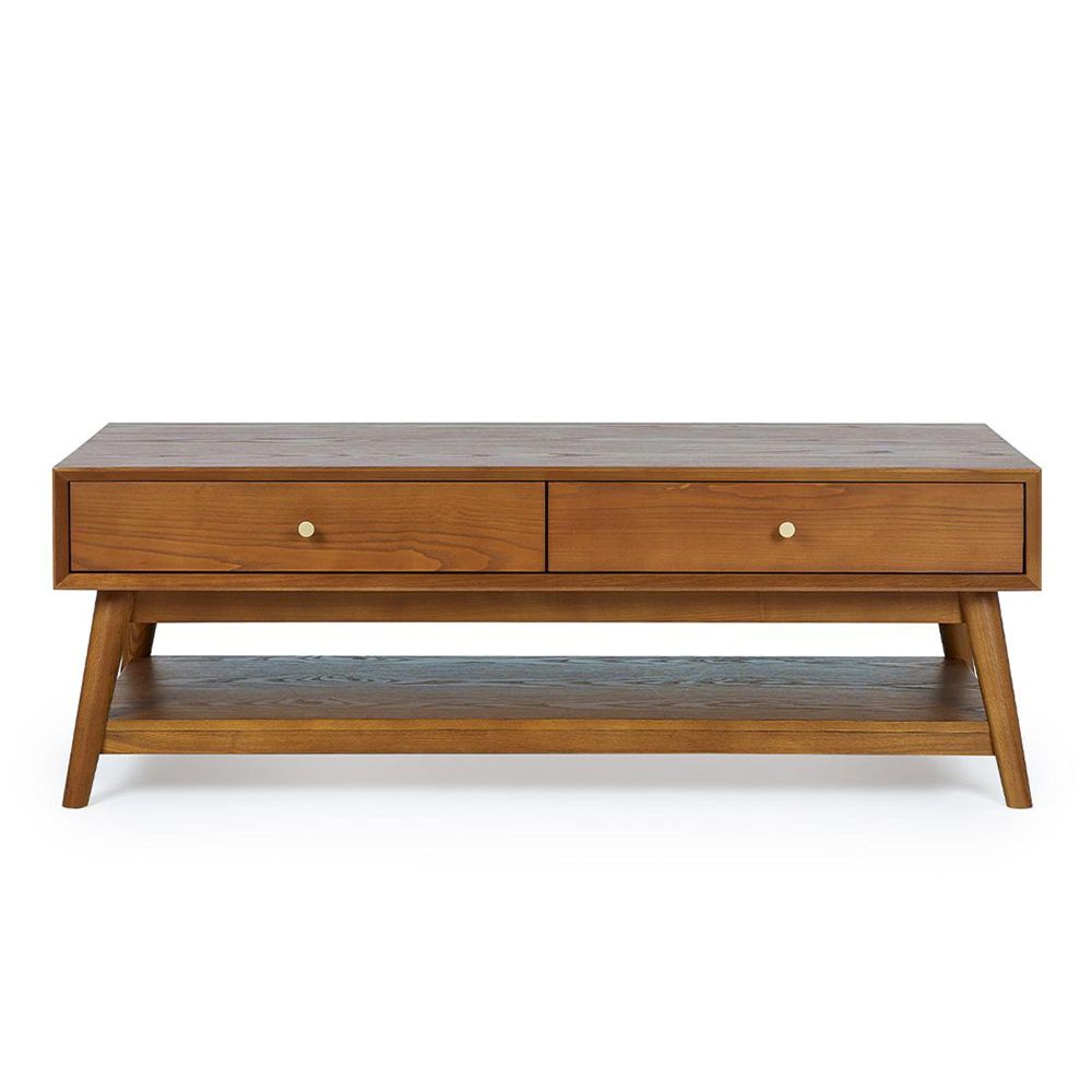 Item Code: LOW005 A gorgeous retro inspired style, the Lowry Coffee Table is constructed from an exquisite cherry ash wood veneer with beautifully tapered legs. Featuring 2 drawers and an efficient shelf for storage. Complemented by gold framed knobs, providing the perfect staple to create an effortless look in any occasional space.