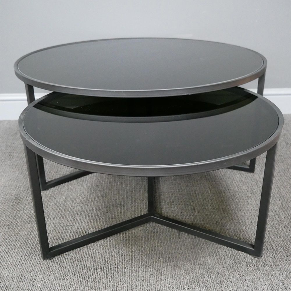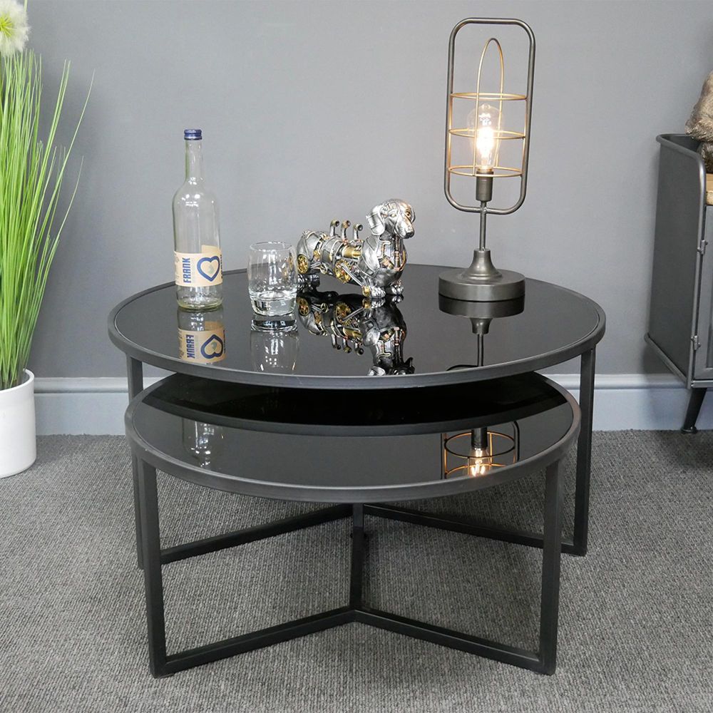 Coffee Table - Round - Black Glass and Metal - Set of 2