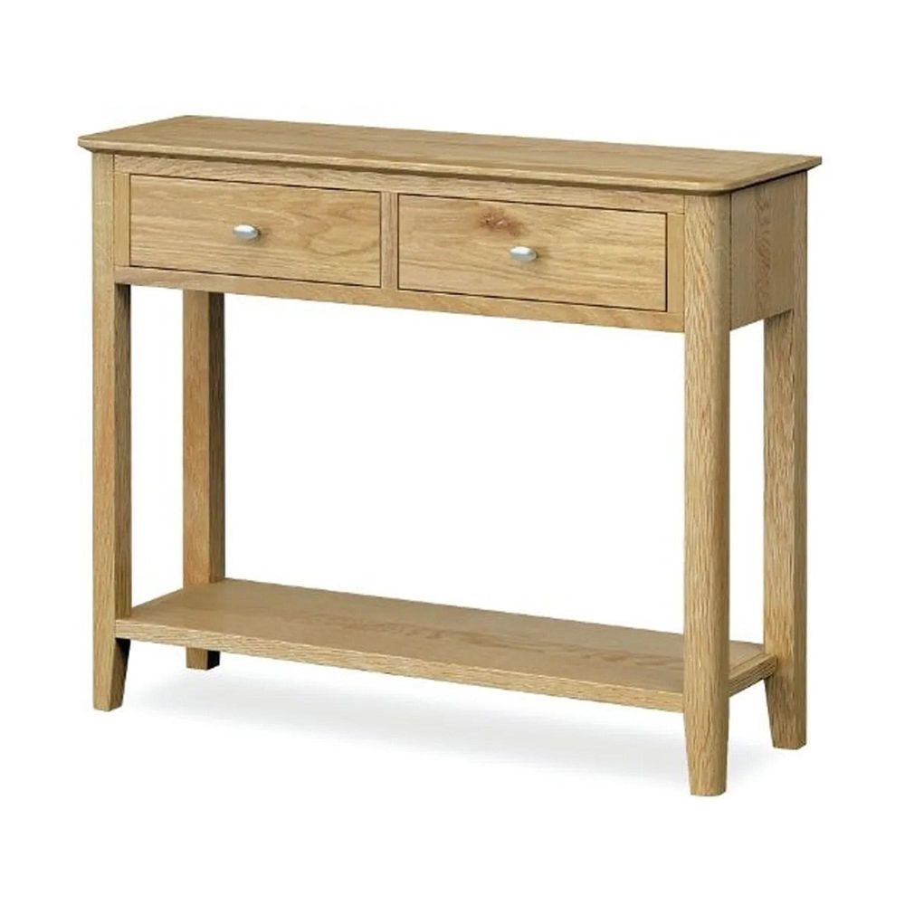 Featuring two spacious drawers with solid metal knobs, this console table provides practical storage for keys, mail, and everyday essentials while keeping surfaces tidy. Its sturdy construction and timeless design make it a functional yet stylish statement piece, perfectly complementing other items in the Bath Oak living and hallway collection.