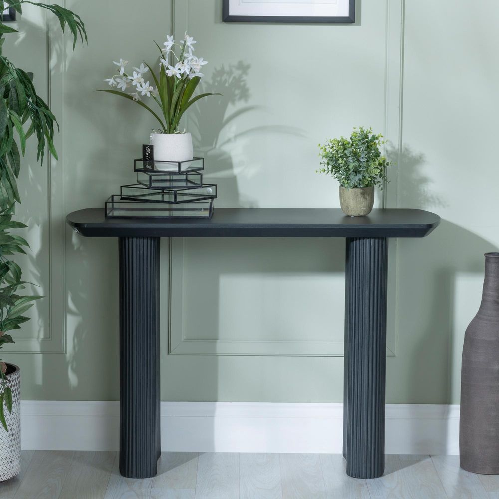 Crafted with attention to detail, the fluted pillar legs offer texture and symmetry, while the rich black finish provides a bold, understated presence. The softly curved edges balance its structured form, adding a refined touch that's ideal for upscale settings. Whether used to display art, hold essentials, or serve as a focal point in a styled vignette, the Bern Console Table is designed to complement modern living with both practicality and poise.