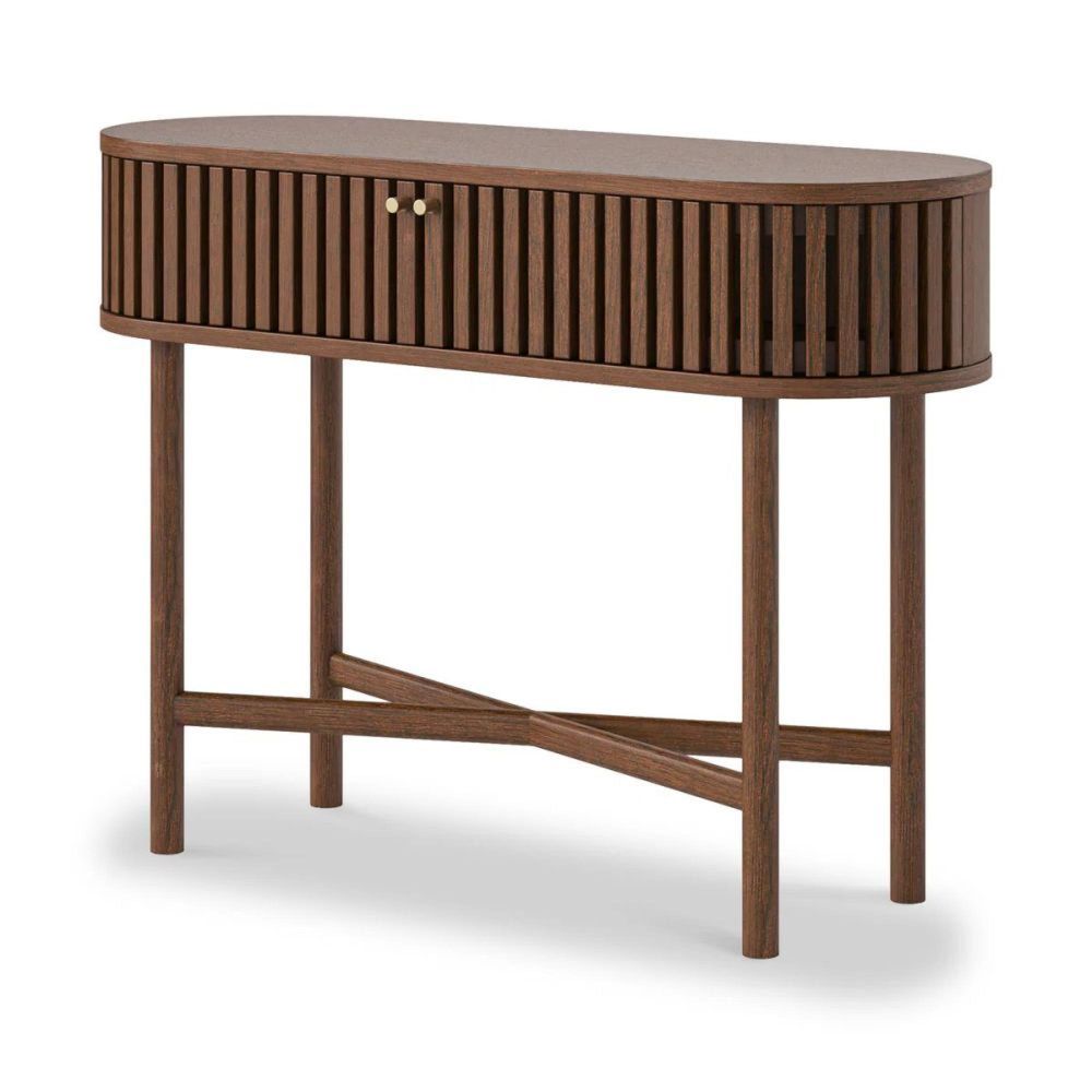 Designed with a versatile oval shape, this console table offers both style and function. The smooth top surface is ideal for lamps, décor, or everyday items, while the storage behind the slatted doors keeps your space organised and clutter-free.