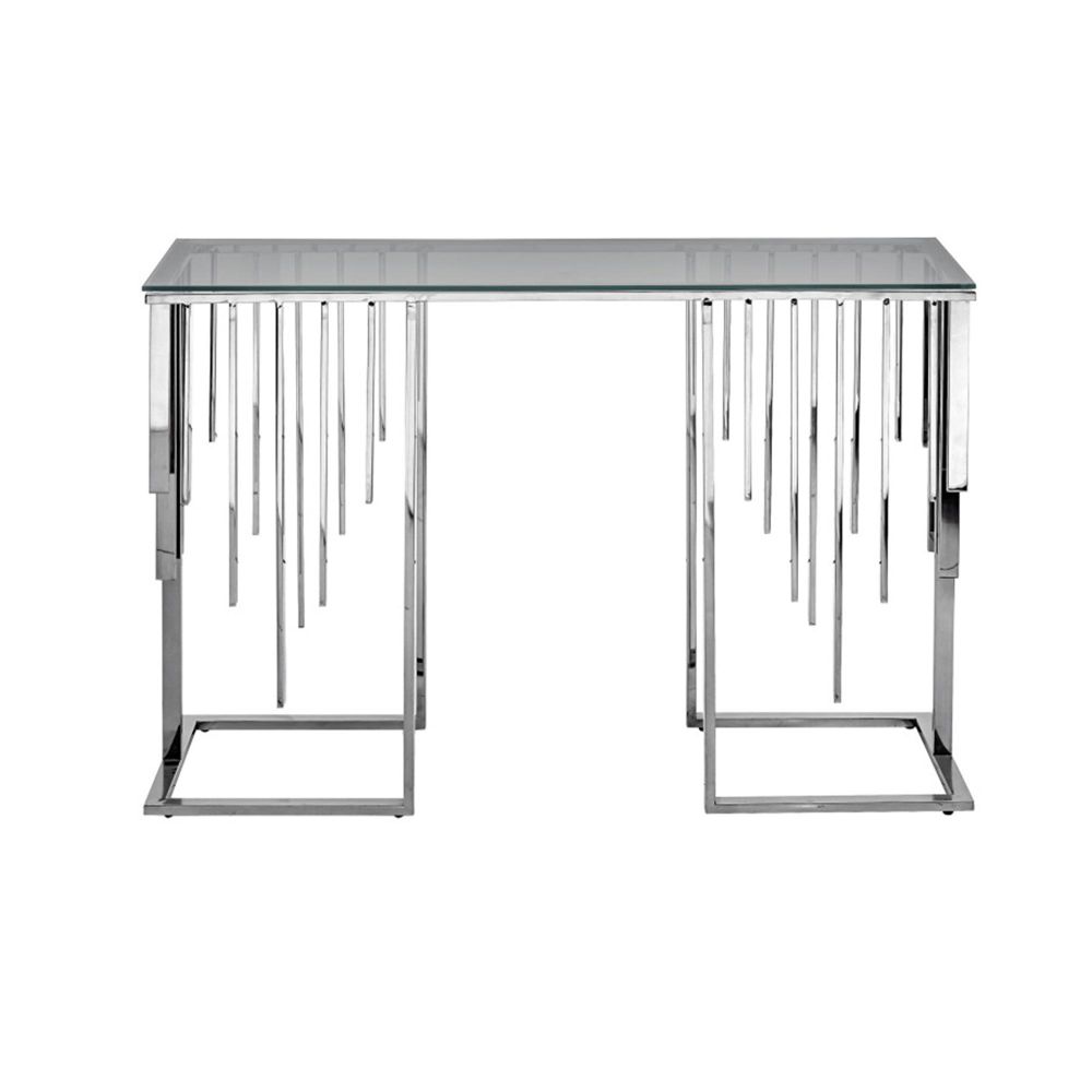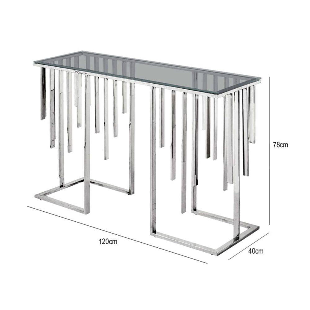 Item Code: MF444-00-GLS-CH Add a touch of modern sophistication to your space with the Owen Chrome Metal Console Table. Crafted with a sleek chrome-finished frame, this piece is both stylish and durable. The smoke glass top offers a contemporary edge, perfect for showcasing decor or keeping essentials within reach. Ideal for hallways, living areas, or entryways, its clean lines suit a variety of interior styles. Functional yet elegant, it makes a striking statement in any setting.Please note: Product color may vary slightly due to lighting and photography.Free Delivery