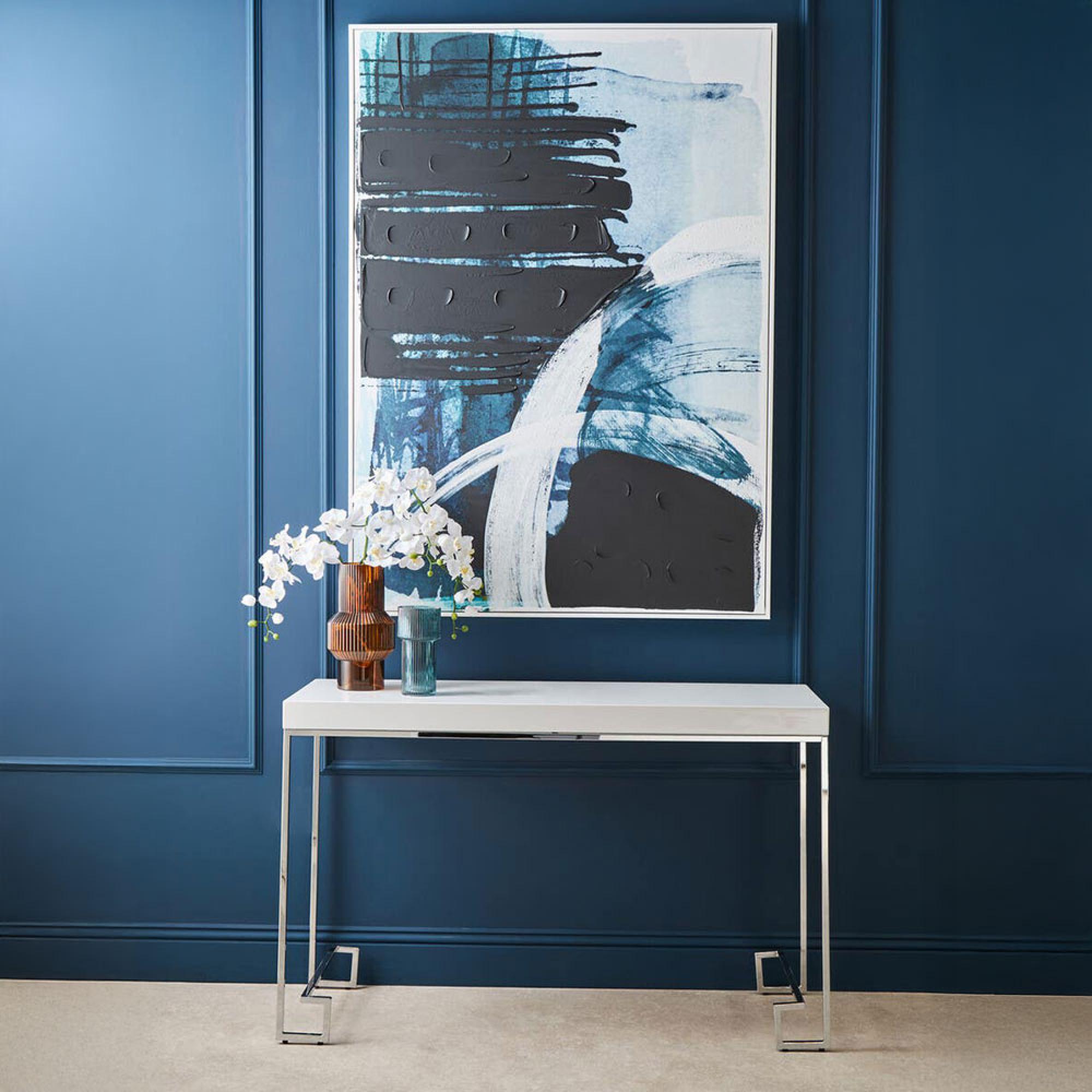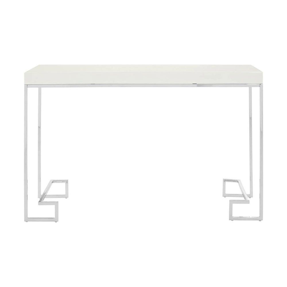 Item Code: 5501369 Allure white high gloss console table with chrome stainless steel legsThe table's thick white high gloss top surface combines with the reflective silver to create a sleek and stylish piece. The legs are formed from smooth stainless steel with squared feet that emphasise its symmetrical lines. Suited to luxurious boutique hotel interiors coordinate it with reflective metal accessories and lighting.