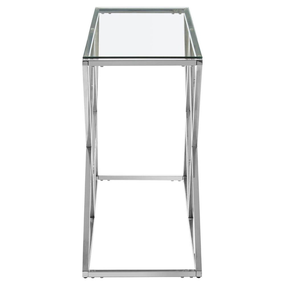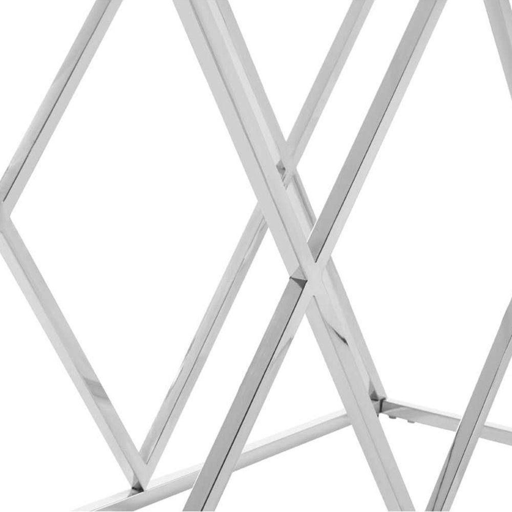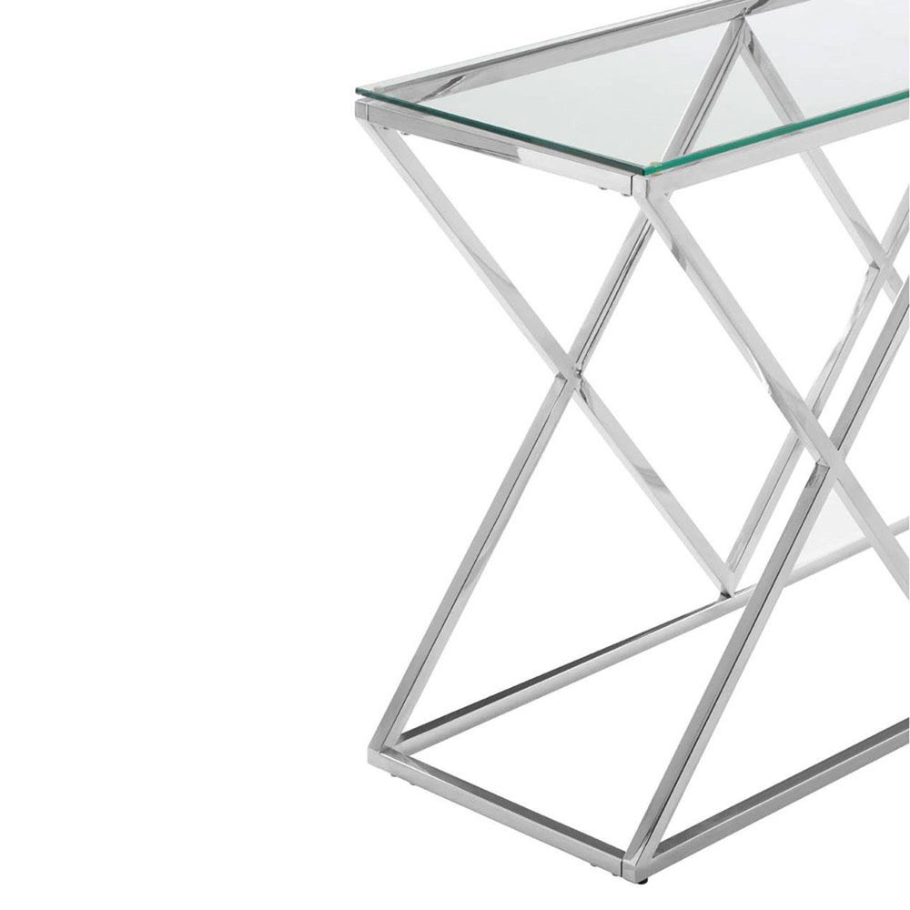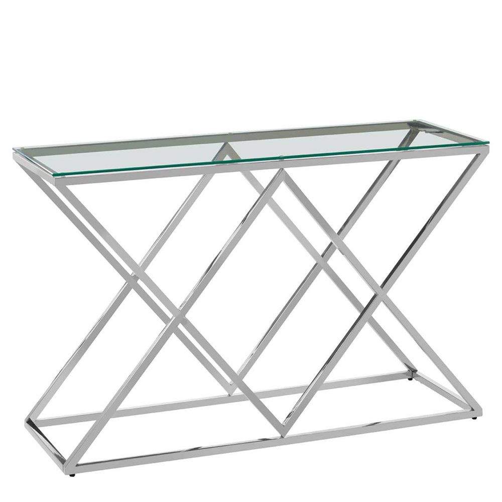 Item Code: 5502546 The Allure console table has a distinctive geometric design with its inverted triangles and reflective stainless steel.Featuring a bold diamond shapes the stainless steel frame has a reflective silver finish and the top is made from clear tempered glass. Display it in the hallway or living room to make a luxe design statement.