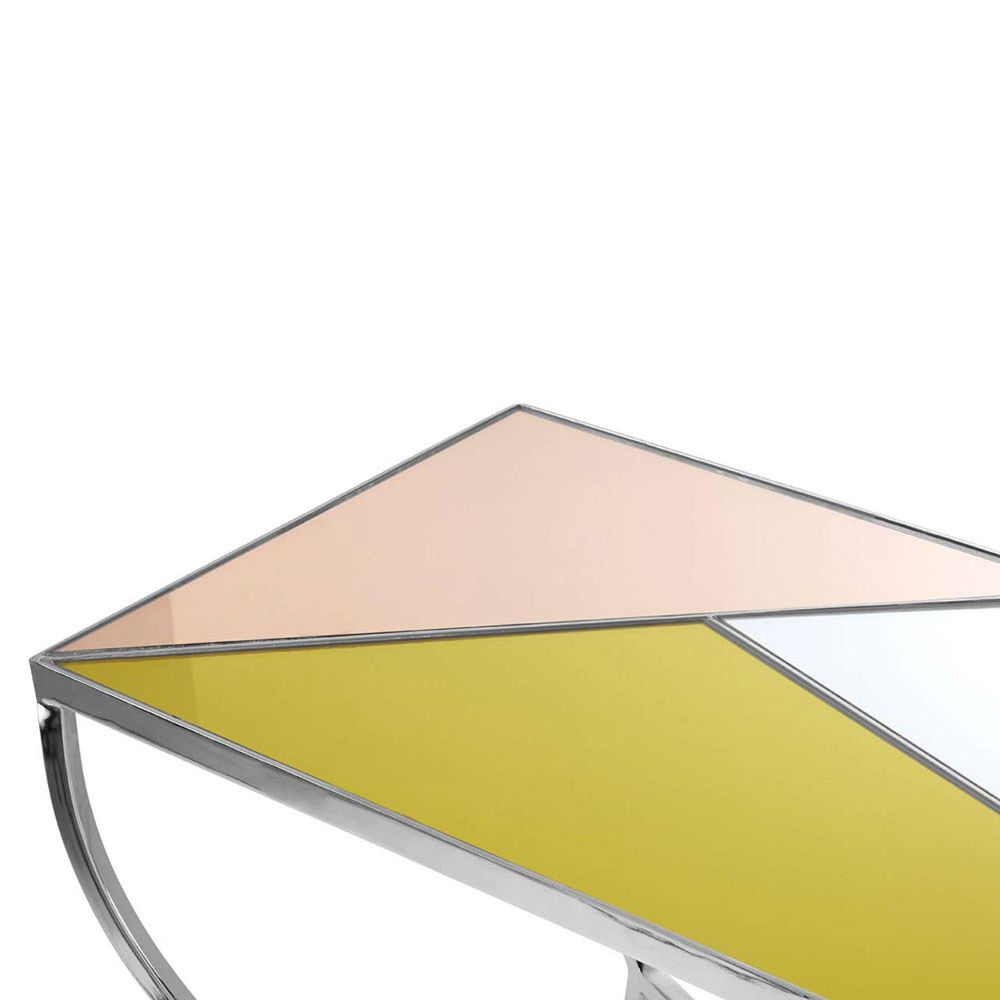 Item Code: 5502382 Minimalist modern art serves as the inspiration for the Arbus console table.The rectangular console table top features a geometric design with segments of gold mirror, pink mirror and reflective mirror separated by strips of stainless steel. The distinctive silver-finish frame is created from stainless steel.