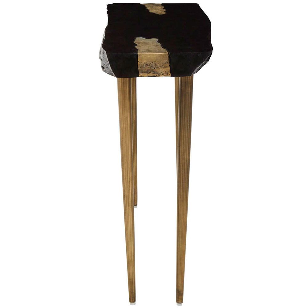 Item Code: 5502794 Made from acacia wood, this console table features a rectangular black top with natural and rustic edges and gold metal legs. Gold colour aluminium filling flows through the tabletop to create a contrast between the black wood grain and metallic detail, ensuring this otherwise rustic console table boasts a luxe aesthetic.
