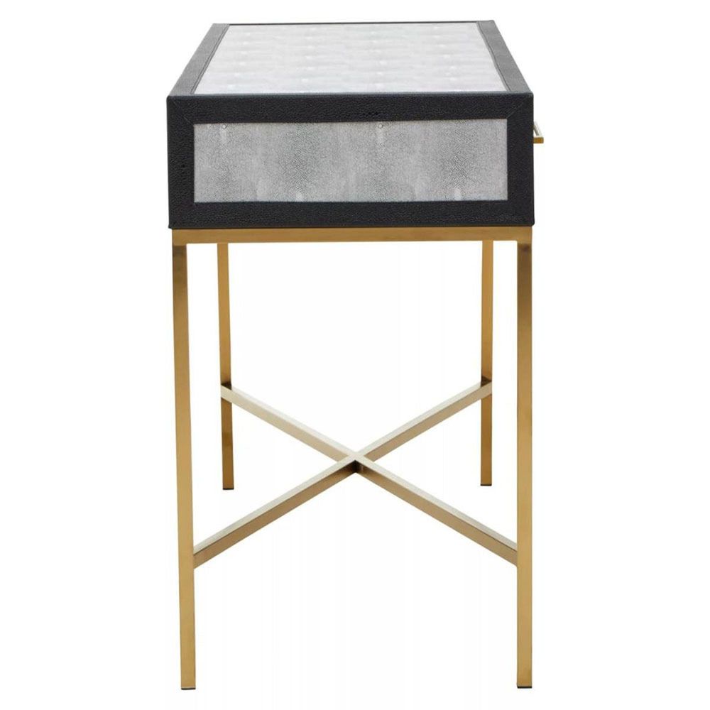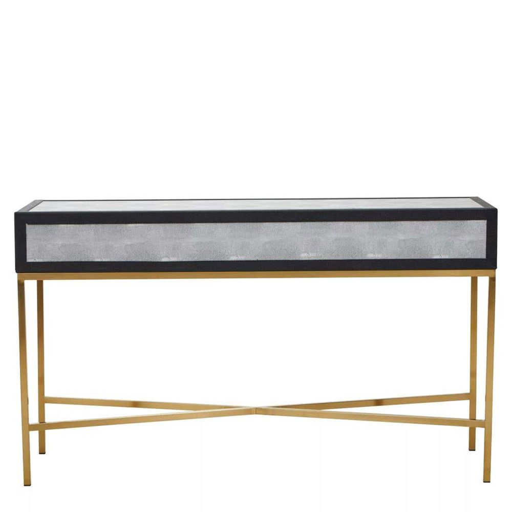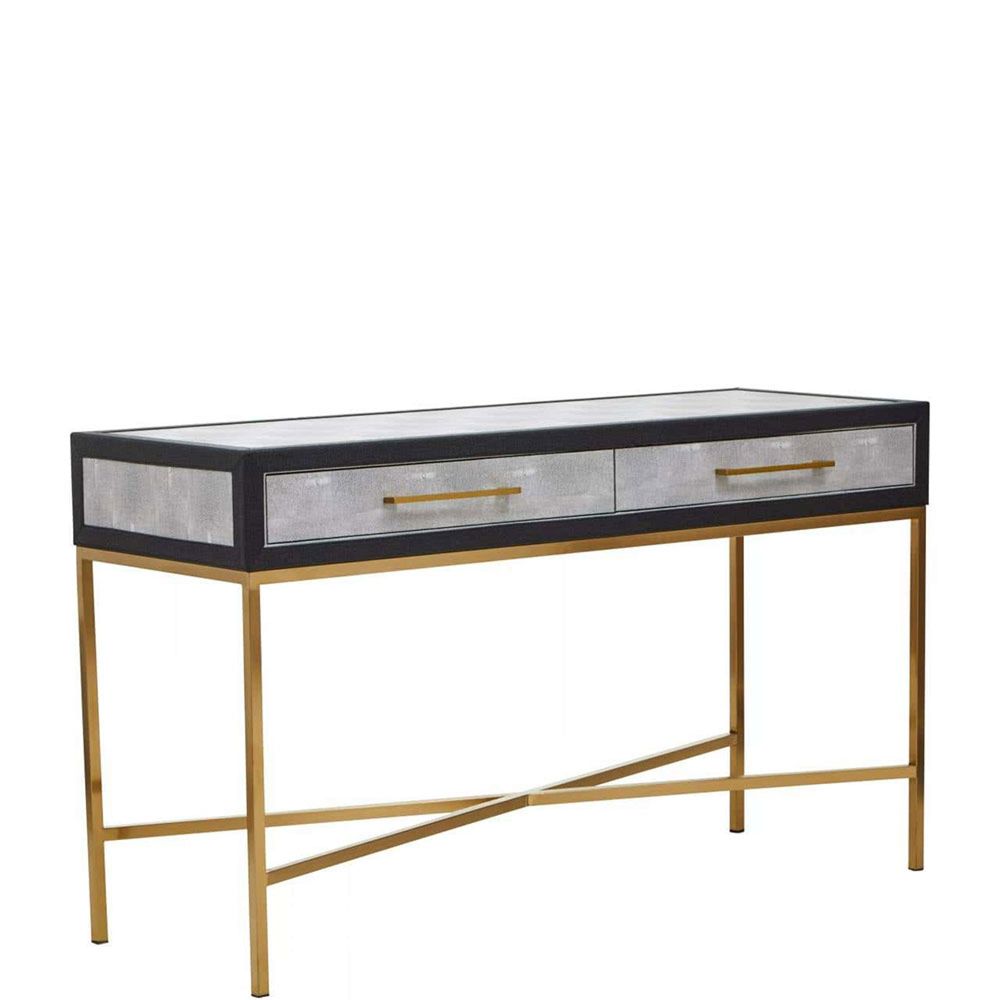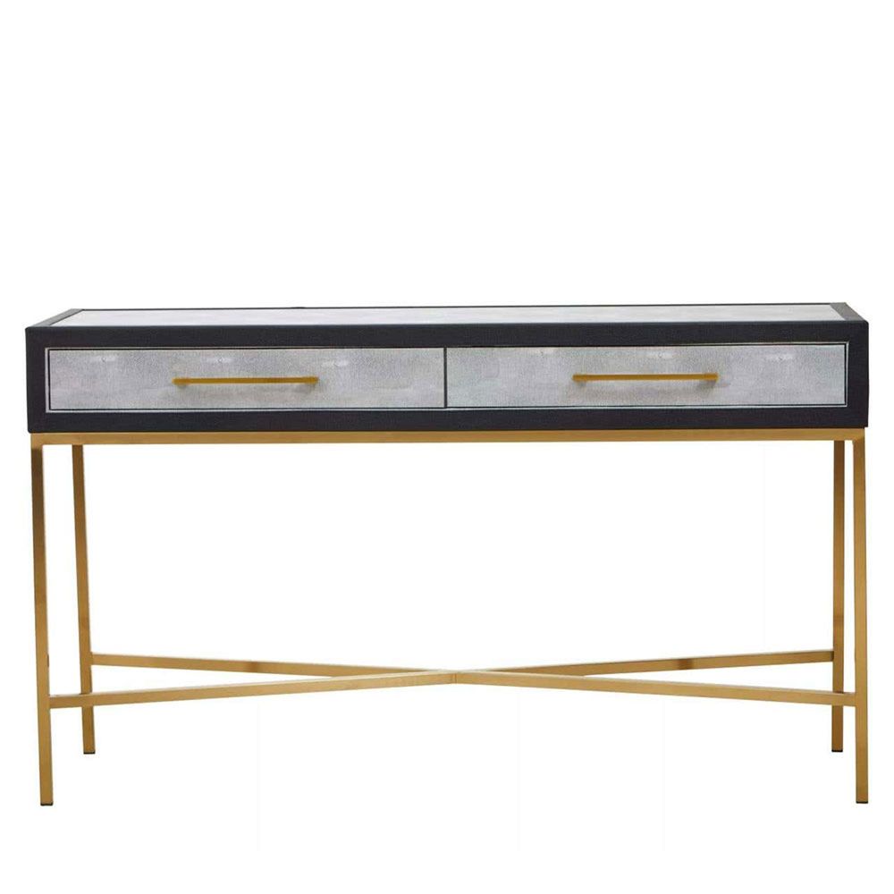 Item Code: 5528856 The Cadiz two drawer console table embodies luxury with its four gracefully crossed legs in a brushed gold finish and grey shagreen body. This console table offers sleek sophistication with its grey shagreen body and a black border. The simple drawer handles and exquisite brushed matte gold cross base provide a stylish contrast to the grey top.