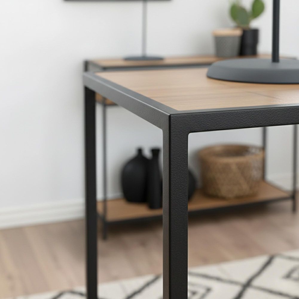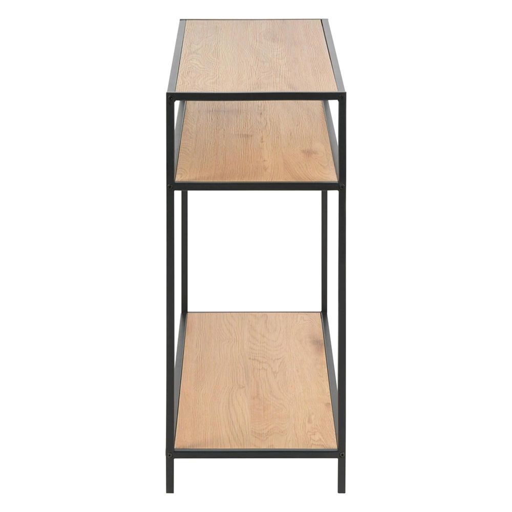 Item Code: 93701 Seaford rectangular console table, top and 2 shelves matt wild oak rough paper, base matt black rough powder coated steel. Finish out a room with style and great storage. Make the most of your space with this versatile console table, which has the personality to blend with many styles of decor. It is perfect for the hallway or living area, and the tabletop and shelfs below let you store your essentials in style. The black powder coated metal frame gives the console an industrial feel and provides stability.Free Delivery
