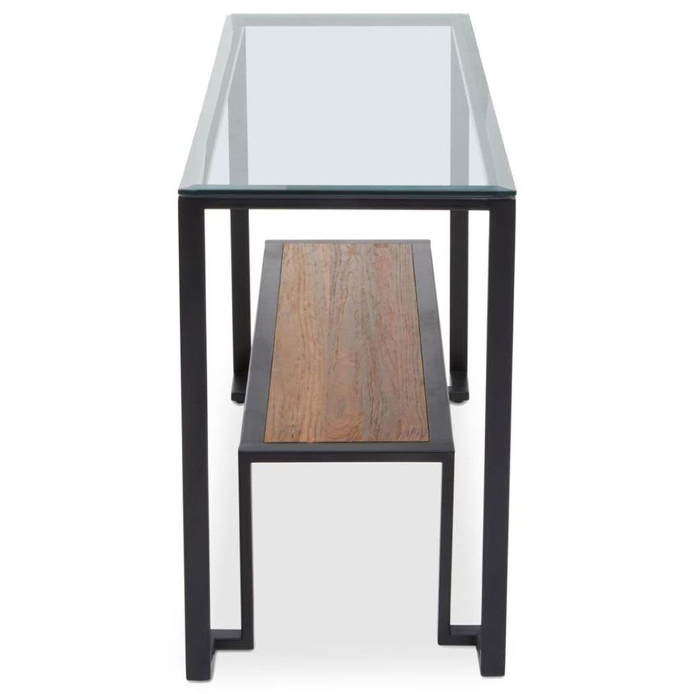 Item Code: 5528246 This modern console table features a clear glass top, a contrasting wooden lower shelf, and a sleek black metal frame.The Cibo Roman console table exhibits a sleek metal frame in a black finish creating a subtle industrial accent in the dining room. A rectangular tempered glass is adjusted neatly on the top and this console table is complete with a teak wood shelf at the bottom.