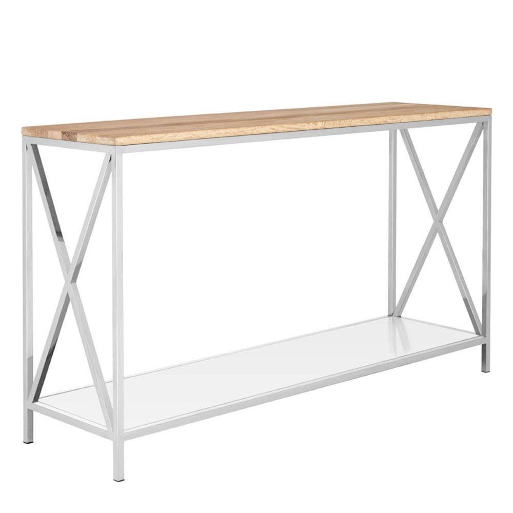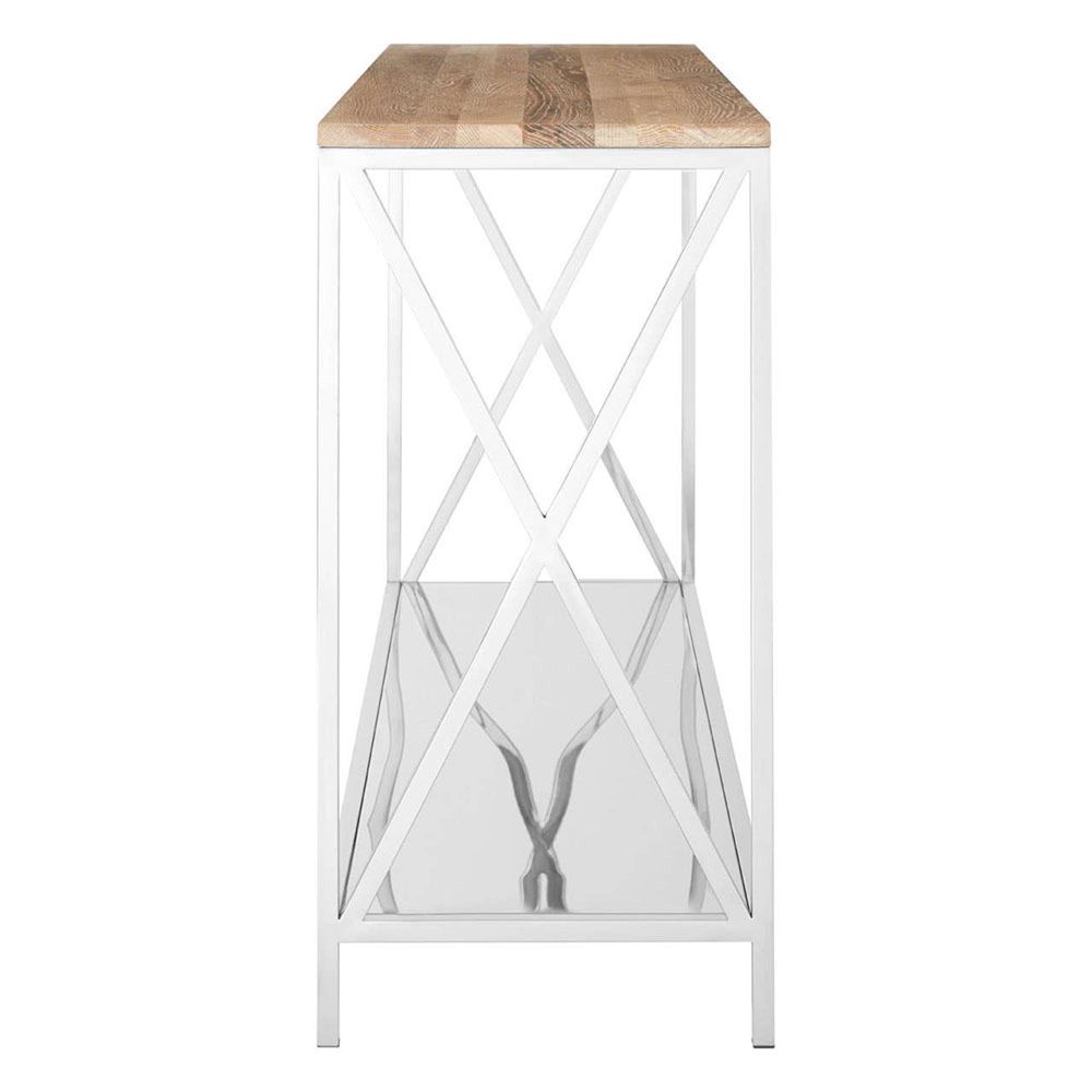 Item Code: 5501147 This contemporary console table features a beautiful, natural oak wood top, showcasing its light tones and distinctive grain. It is supported by a sleek stainless steel frame, which incorporates modern X-shaped detailing on the sides for both stability and aesthetic appeal. A practical lower shelf, in a contrasting white finish, provides additional storage or display space, making this piece a stylish and functional addition to a hallway, living room, or entryway. This contemporary console table features a beautiful, natural oak wood top, showcasing its light tones and distinctive grain. It is supported by a sleek stainless steel frame, which incorporates modern X-shaped detailing on the sides for both stability and aesthetic appeal. A practical lower shelf, provides additional storage or display space, making this piece a stylish and functional addition to a hallway, living room, or entryway.