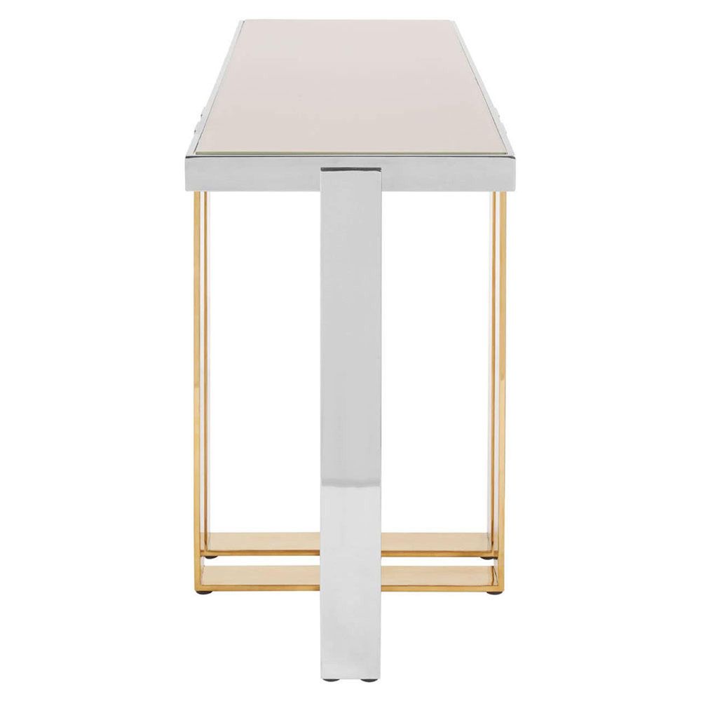 Item Code: 5527239 The sleek Demas console table brings contemporary luxe style to the home.Its rectangular top is made from frosted glass to provide the design with a touch of translucence. The minimal stainless steel frame does not impose on its surroundings, and has a silver finish to contrast with the large gold coloured metal lines.