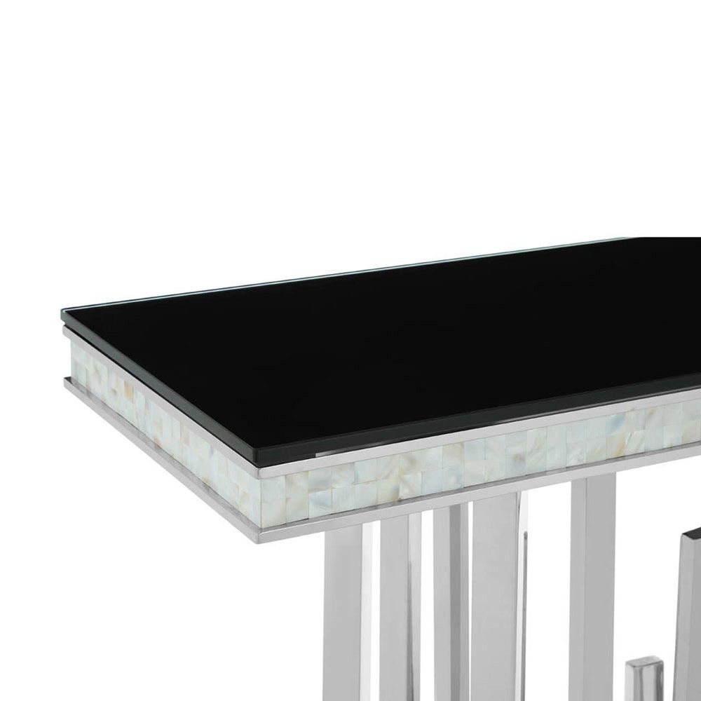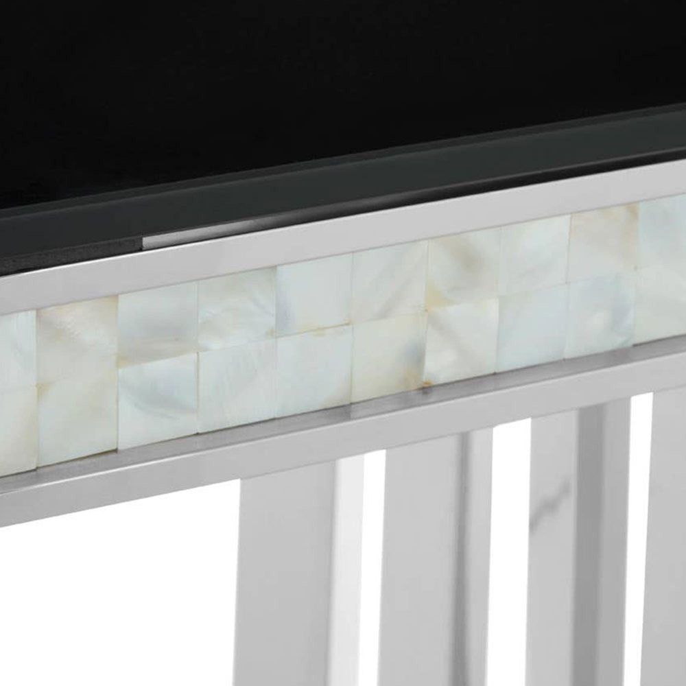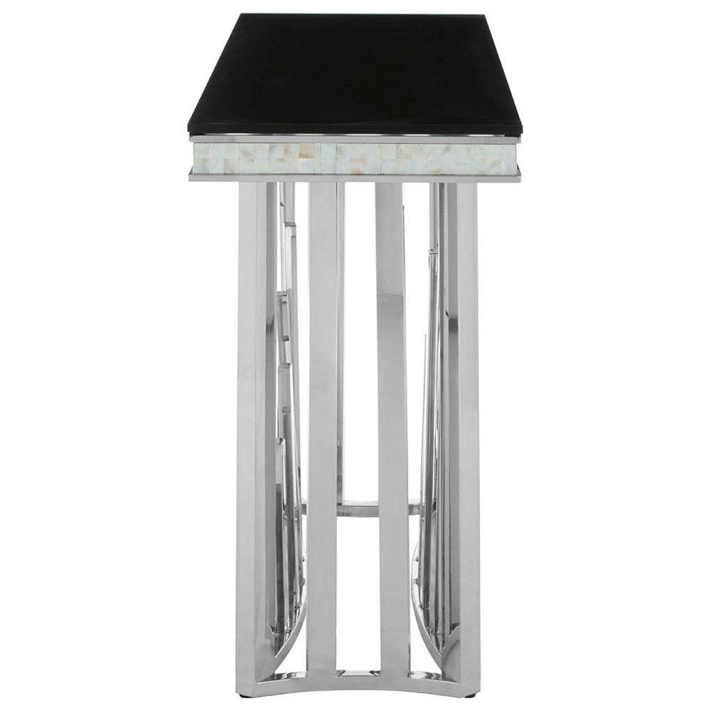 Item Code: 5501958 The Eliza console table adds art deco glamour to interior settings with its faux other of pearl inlay.The console table's stepped base is created from strong stainless steel with a striking reflective silver finish. Counterpointing the cool metallic base is the table's sleek black tempered glass top.