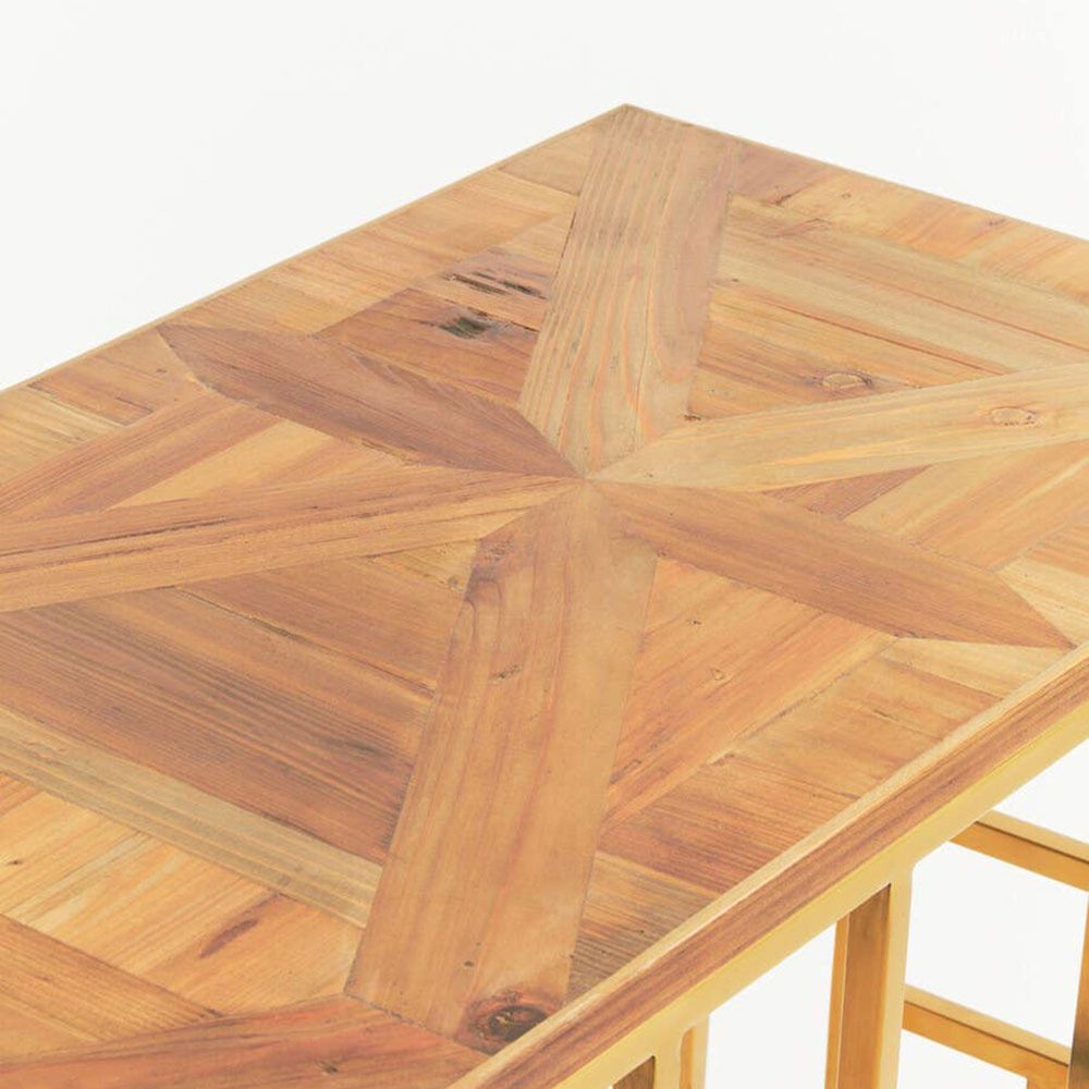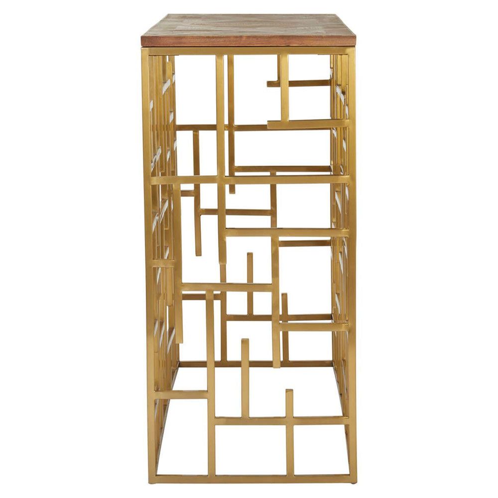 Item Code: 5528087 Combing natural and luxe elements, this console table introduces an ultra-modern design.The gold finish stainless steel forms a maze design in the warm metallic finish. A rectangular slab of aged fir wood forms a tonal contrast with the luxe elements, featuring rustic elegance, warmth and texture.