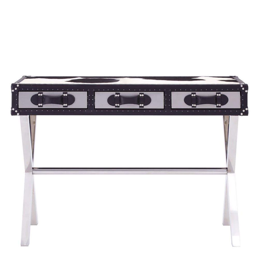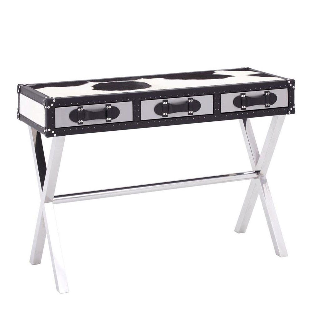 Item Code: 5501111 This luxury console table is supported by a cross legged stand made from reflective stainless steel, and boasts three drawers.Each drawer features a strap handle made from real leather, complementing the trim on the table's edges. Silver studs and pins introduce a metallic counterpoint to the table's tactile natural materials.