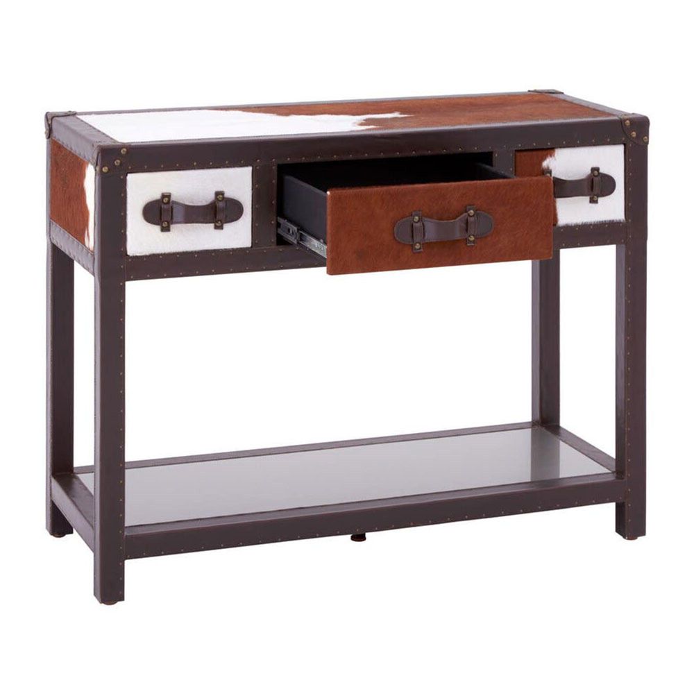 Item Code: 5501172 It's slim legs and cabinet edging are dressed in real leather, coloured brown to coordinate with the tactile cowhide.The cabinet features a trio of drawers with real leather handles. Stud detail adds a metallic accent to the natural materials and complements the stainless steel display shelf at the base.