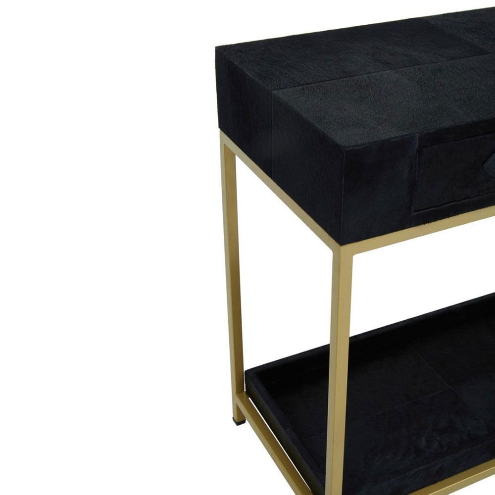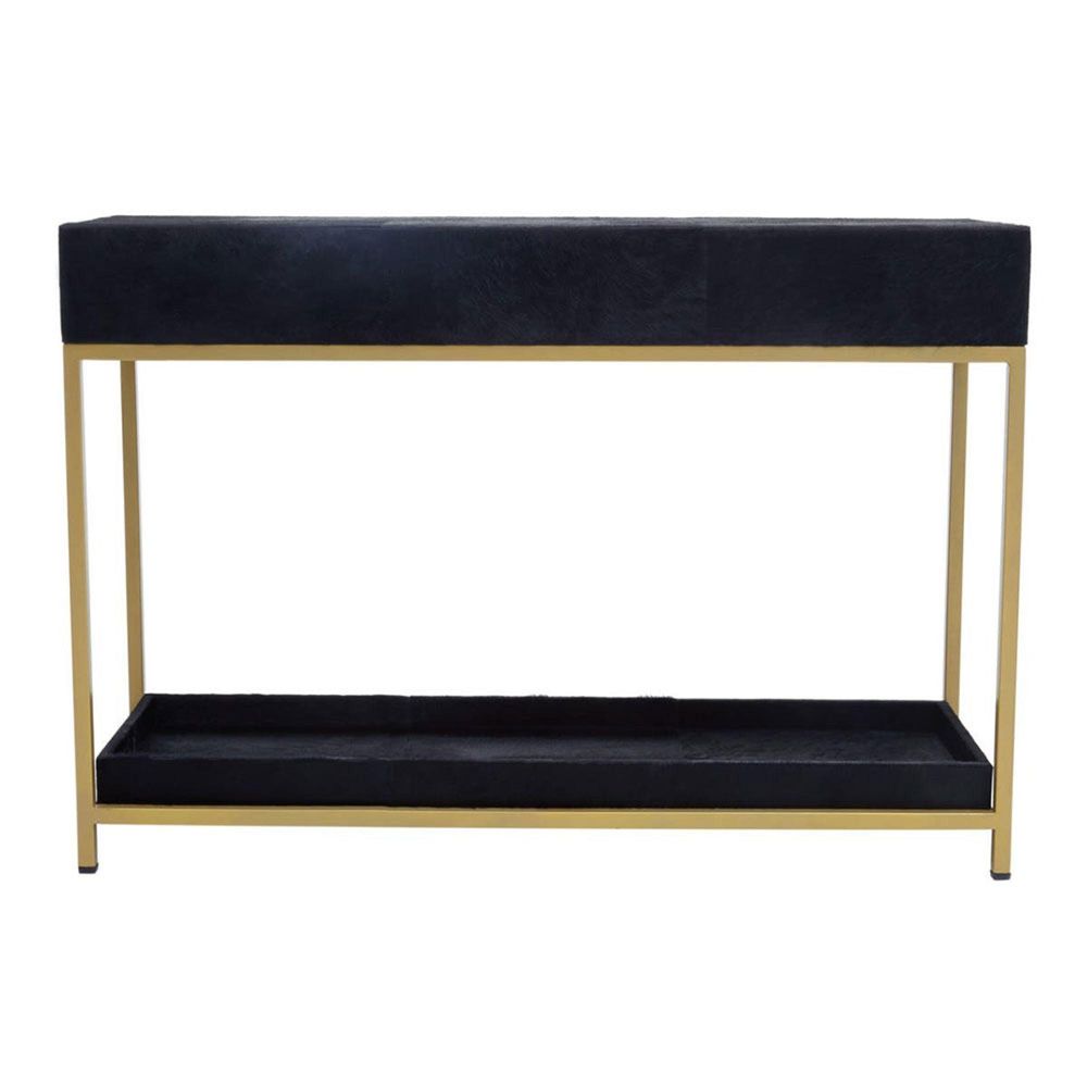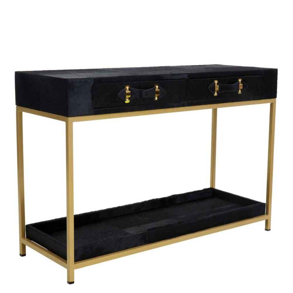 Item Code: 5528995 This luxurious black hair-on-leather console table has a gold-finished metal frame, featuring two storage drawers and a lower open shelf, perfect for chic, modern interiors.This Kensington Townhouse console table is almost decadent. The black hair on hide exterior is complemented by 2 drawers offering ample storage solution and supported by the gold frame, creating a luxe modern look.