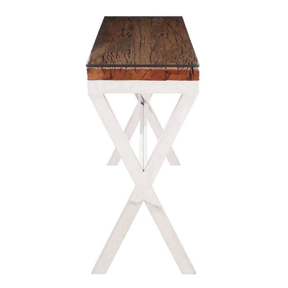 Item Code: 5527844 Kerala console table with natural salvaged wood top and silver finish stainless steel baseNatural salvaged wood forms rectangular top of this console table, further enhanced with the clear glass slab. The cross base in mirrored silver finish offers a tonal contrast to the natural elements and rustic texture.