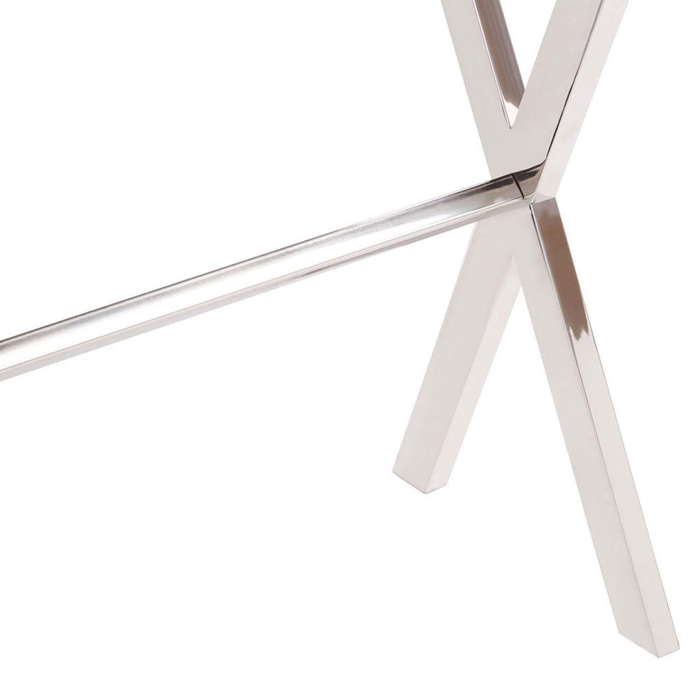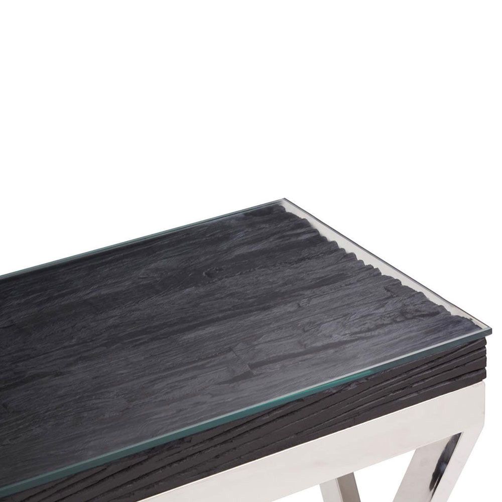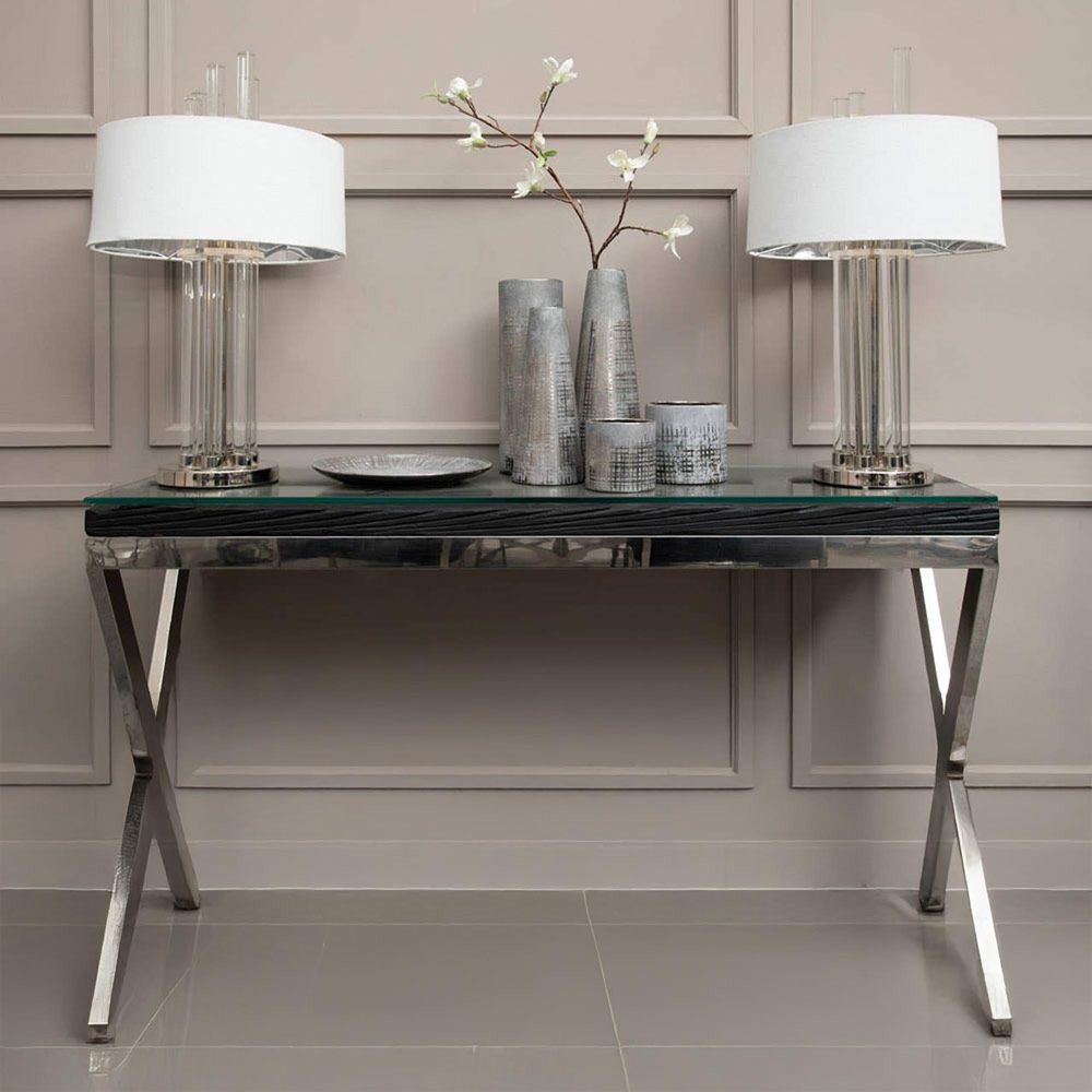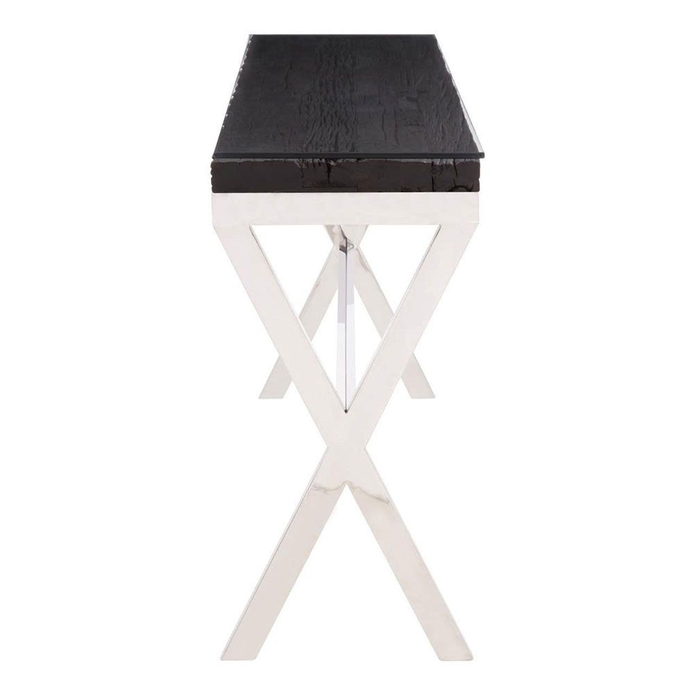 Item Code: 5527845 The Kerala console table has black natural wood top with glass, sitting on a stainless steel frame with crossed legs, providing a stable structure.This console table has a silver stainless steel frame with crossed legs to provide stability. The frame combines with a black natural wood top with glass, creating an elegant look suited for showcasing luxe items.