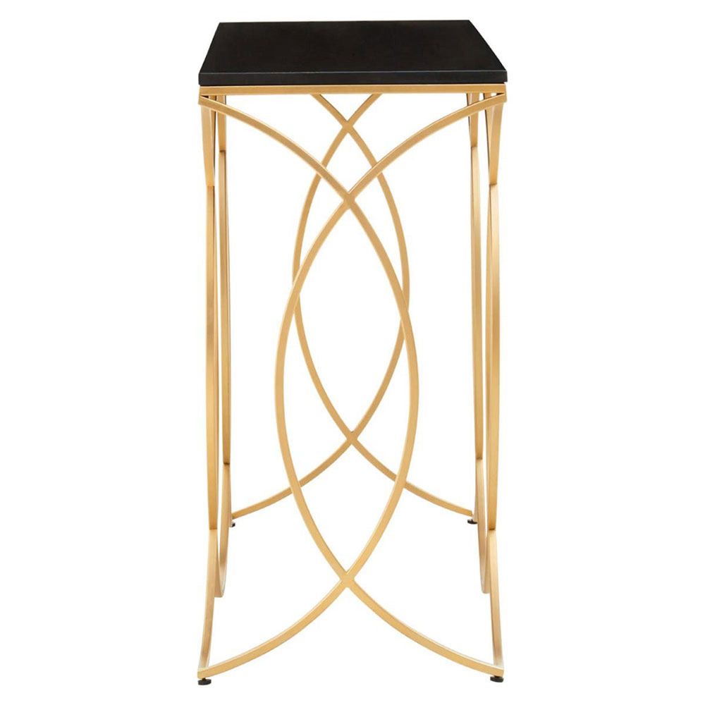 Item Code: 5529602 The Kia console table comes with a sleek black marble top and a gold finish stainless steel frame, adding a touch of elegance to any space.This console table is the perfect blend of luxury and functionality with its elegant black marble top supported by a curved gold finish stainless steel frame. It provides ample space with its spacious top.