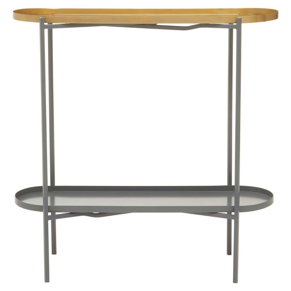 Item Code: 5528946 The Korba console table will make a functional and fashionable addition to the home office space.This console table features two oblong shelves with raised edges that are fixed neatly in a sleek and slender metal frame. The elegant contrast of matte gold and grey enamel coating enhances the modern glam appeal in the living area.